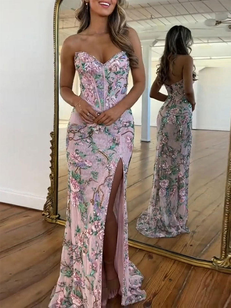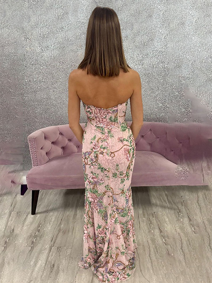 Bloom with elegance in this exquisite pink prom gown, designed for the girl who wants to embody the spirit of a secret garden. The bodice creates a captivating silhouette with a strapless sweetheart neckline featuring a plunging notch, supported by a trendy sheer corset structure with visible boning that elongates the torso. The gown is a masterpiece of texture, adorned with intricate multicolored floral embroidery and sequins in shades of pink and green that climb across the fabric like enchanting vines. The fitted skirt hugs the curves before opening into a soaring thigh-high slit, balancing the sweet botanical motif with a sultry, confident edge. Perfect for spring proms, garden weddings, or any event where you want to look effortlessly romantic.