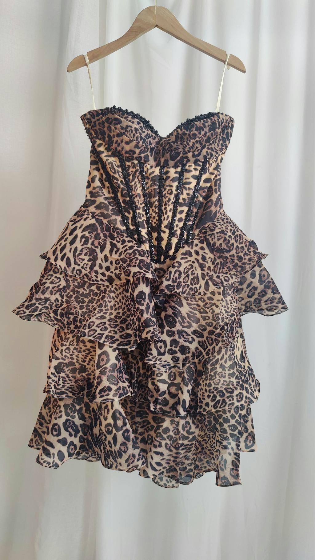 Unleash your wild side with this fierce and flirty leopard print homecoming dress—a bold statement piece for the girl who owns every room she walks into. The strapless corset bodice is beautifully structured with boning and adorned with intricate black beading along the sweetheart neckline, adding a touch of glam to the wild aesthetic. The voluminous A-line skirt features cascading ruffle tiers in sheer fabric, giving the look playful movement and high-fashion flair. Perfect for homecoming, themed parties, or a standout night out, this dress roars with confidence and charm.