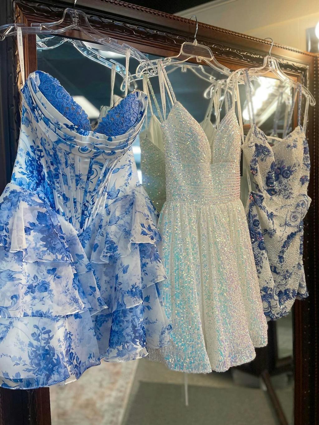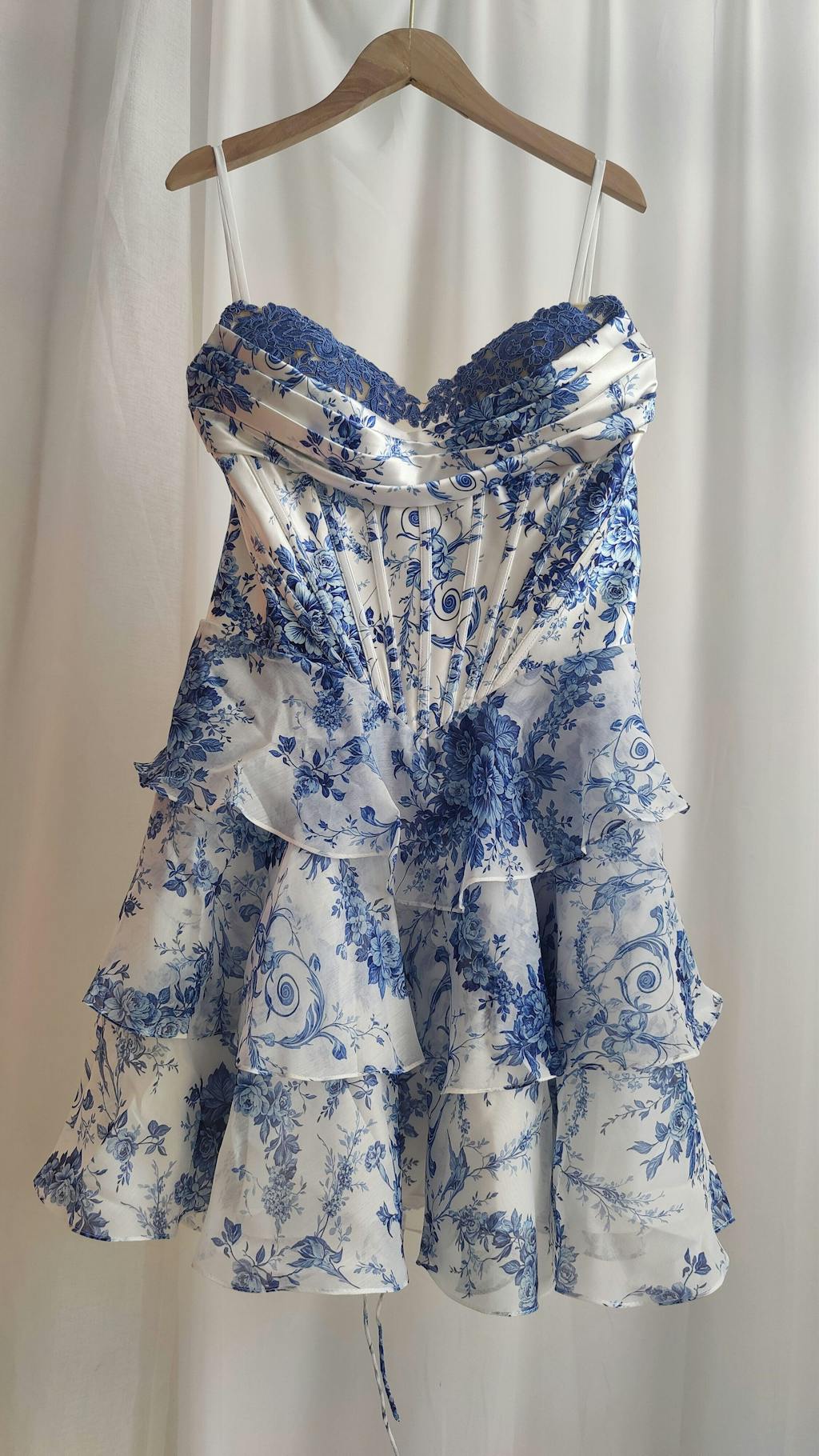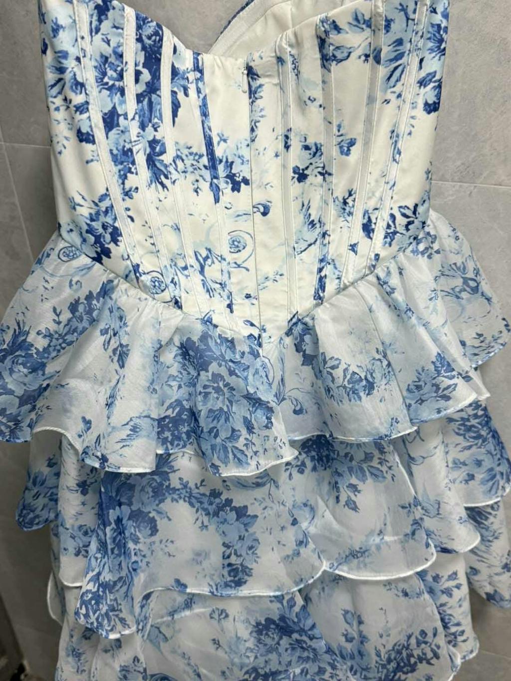 - Features: Sheer Corset Bodice, Tiered Skirt, Floral Embellishments
