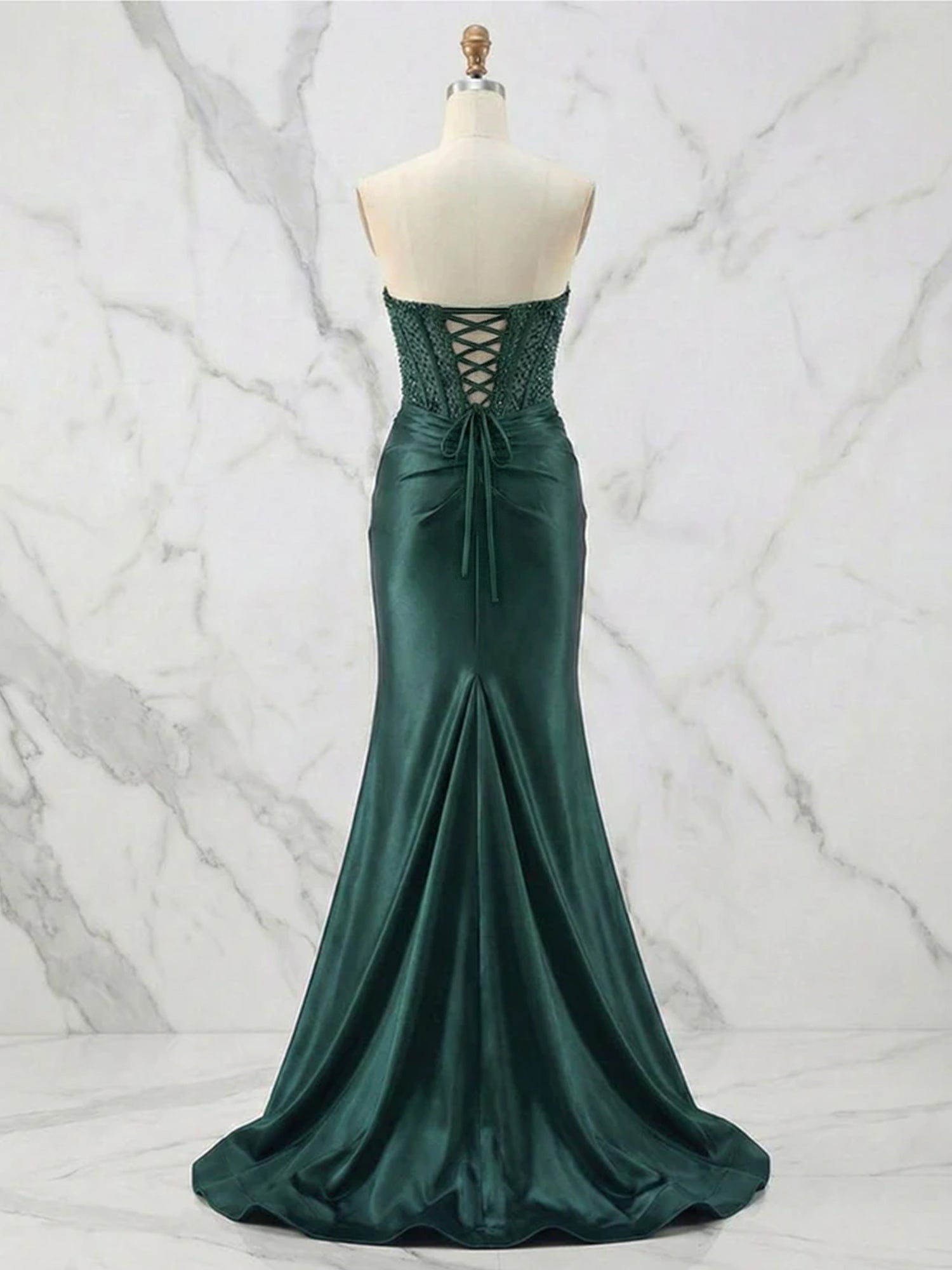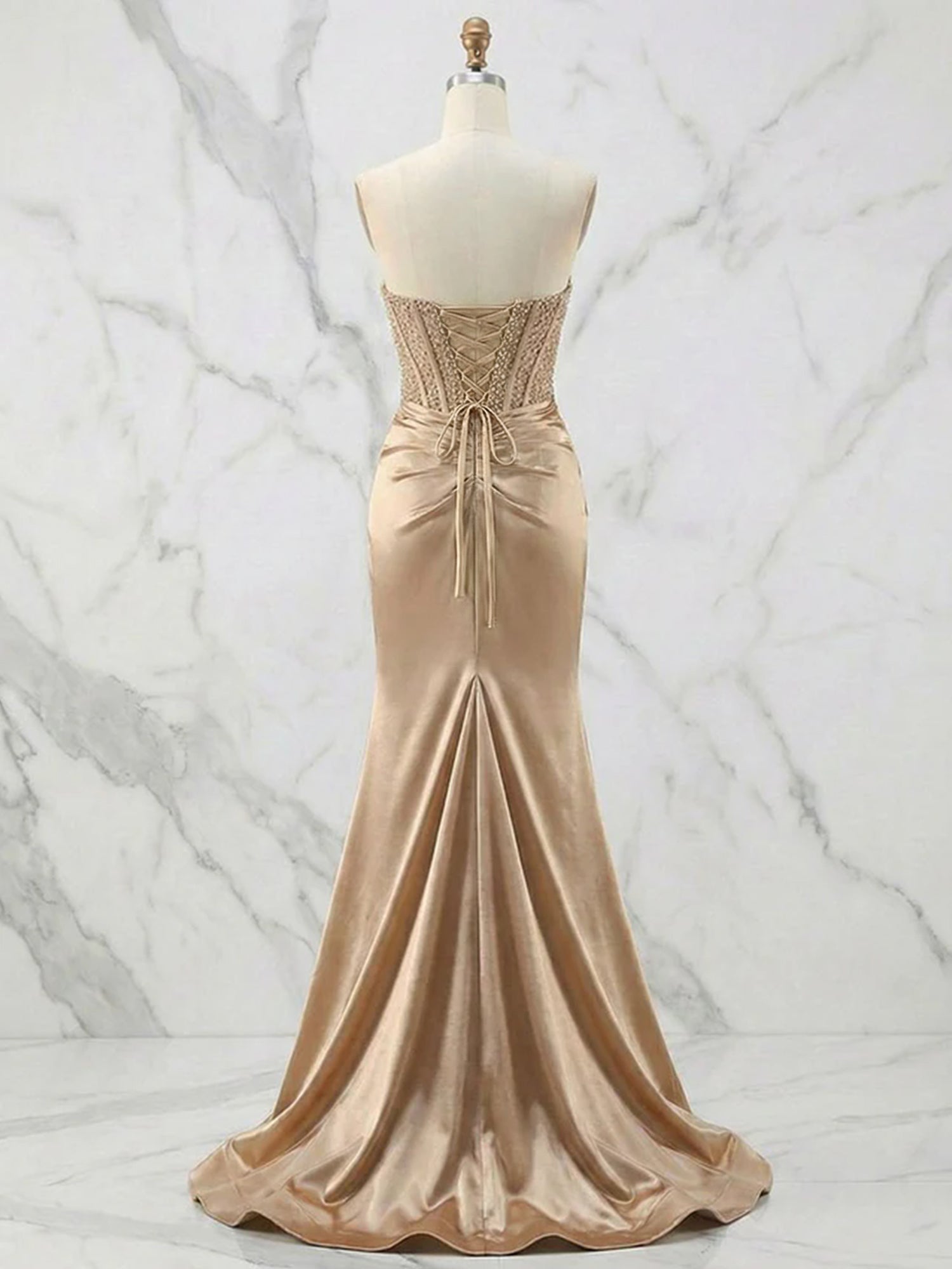 Glamorous Strapless Beaded Corset Satin Prom Dress with Slit