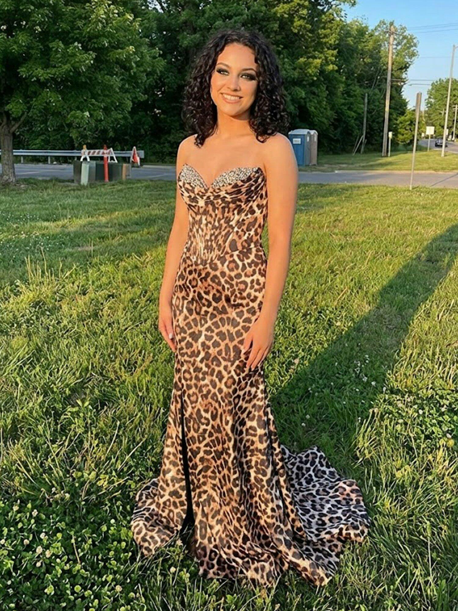 Exude pure glamour in this stunning leopard print prom gown, designed to command attention with its bold pattern and sultry silhouette. The figure-hugging mermaid style is perfected with a structured corset bodice, featuring visible boning for a sleek and defined fit. The strapless sweetheart neckline is heavily adorned with dazzling beadwork and rhinestones that sparkle under the light, drawing the eye upward. The skirt hugs your curves through the hips before flaring out gracefully to the floor, creating a dramatic and sophisticated look. Perfect for formal galas, proms, or red-carpet events, this gown ensures you make a memorable entrance, feeling confident and luxurious.