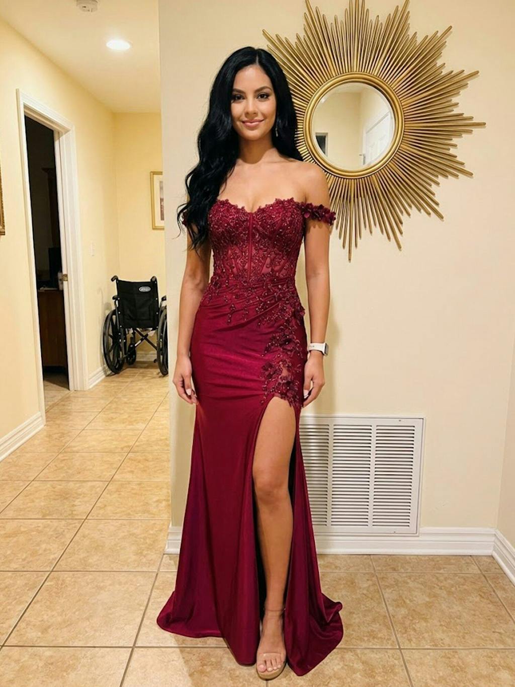 Exude passion and sophisticated elegance in this deep burgundy prom gown, designed to captivate with its rich color and intricate details. The bodice features a trendy sheer corset structure with visible boning, heavily embellished with shimmering beads and sequins that catch the light. Romantic off-the-shoulder straps are adorned with clusters of 3D floral appliques, which also cascade down the waist and trace the edge of the daring thigh-high slit. The skirt is crafted from smooth, luxurious satin that hugs the curves in a flattering mermaid silhouette before flowing to the floor. Perfect for winter formals, proms, or black-tie weddings, this gown is a seamless blend of modern allure and classic romance.