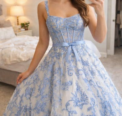 Blue Floral A Line Baroque Lace Corset Long Prom Dress