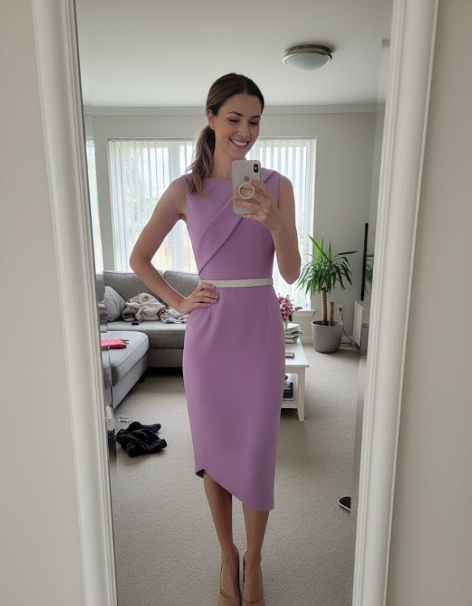 This purple dress is perfect for a semi-formal party with its elegant round neck, sleeveless design, and asymmetrical hemline. The rhinestone waist belt adds a touch of sparkle, making this midi dress a standout piece for any event.