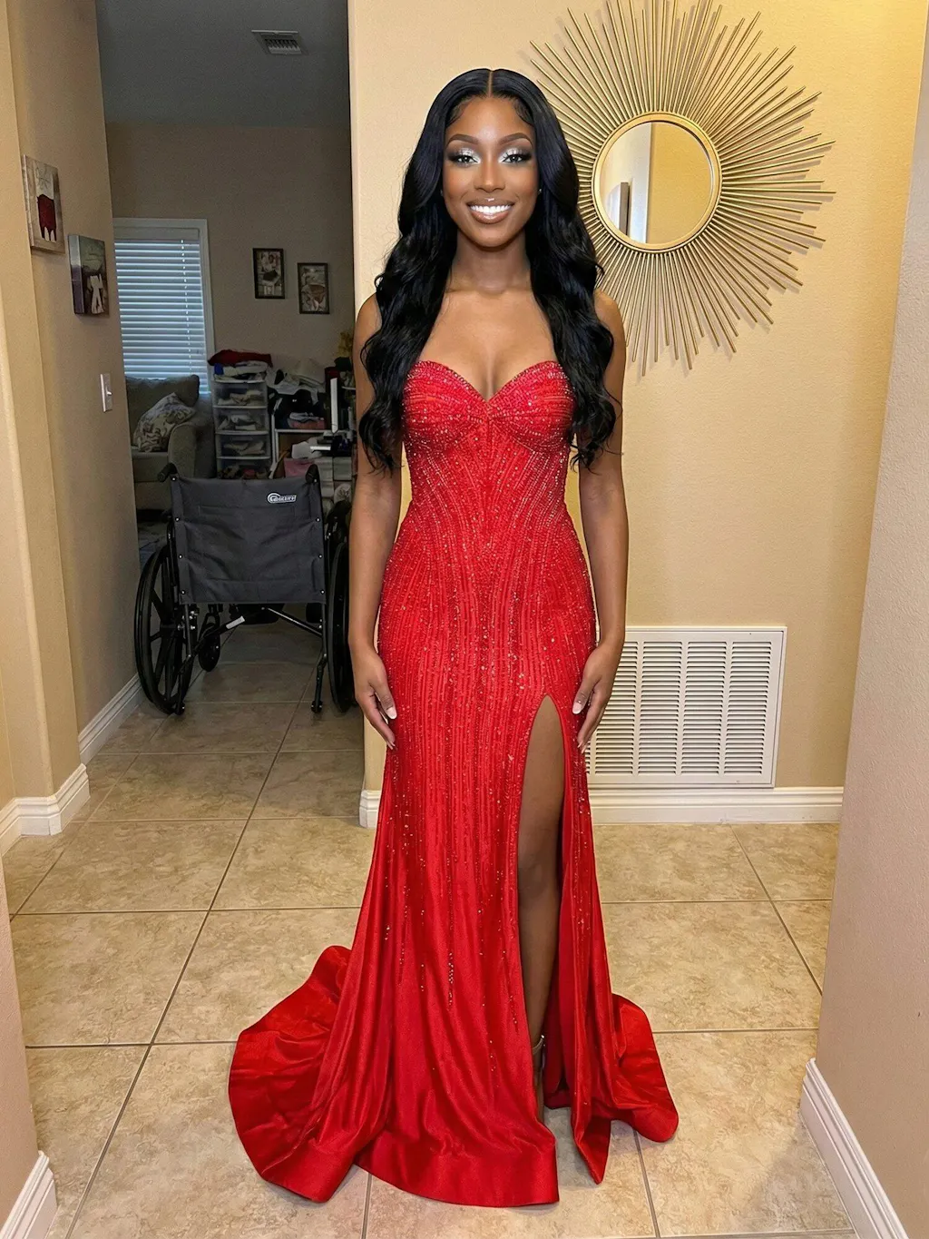 Shine like a starry night in this exquisite midnight blue prom gown. The dress features a classic strapless sweetheart neckline and a structured bodice designed with vertical seaming to elongate the torso. The entire gown is embellished with a stunning linear pattern of sequins and beads that trickle down the length of the dress, creating a mesmerizing, slimming effect. A daring high thigh slit adds movement, while the back view reveals a functional lace-up corset closure, ensuring a perfectly customized fit. This gown is a sophisticated choice for prom, galas, or any evening event where you want to sparkle with elegance.