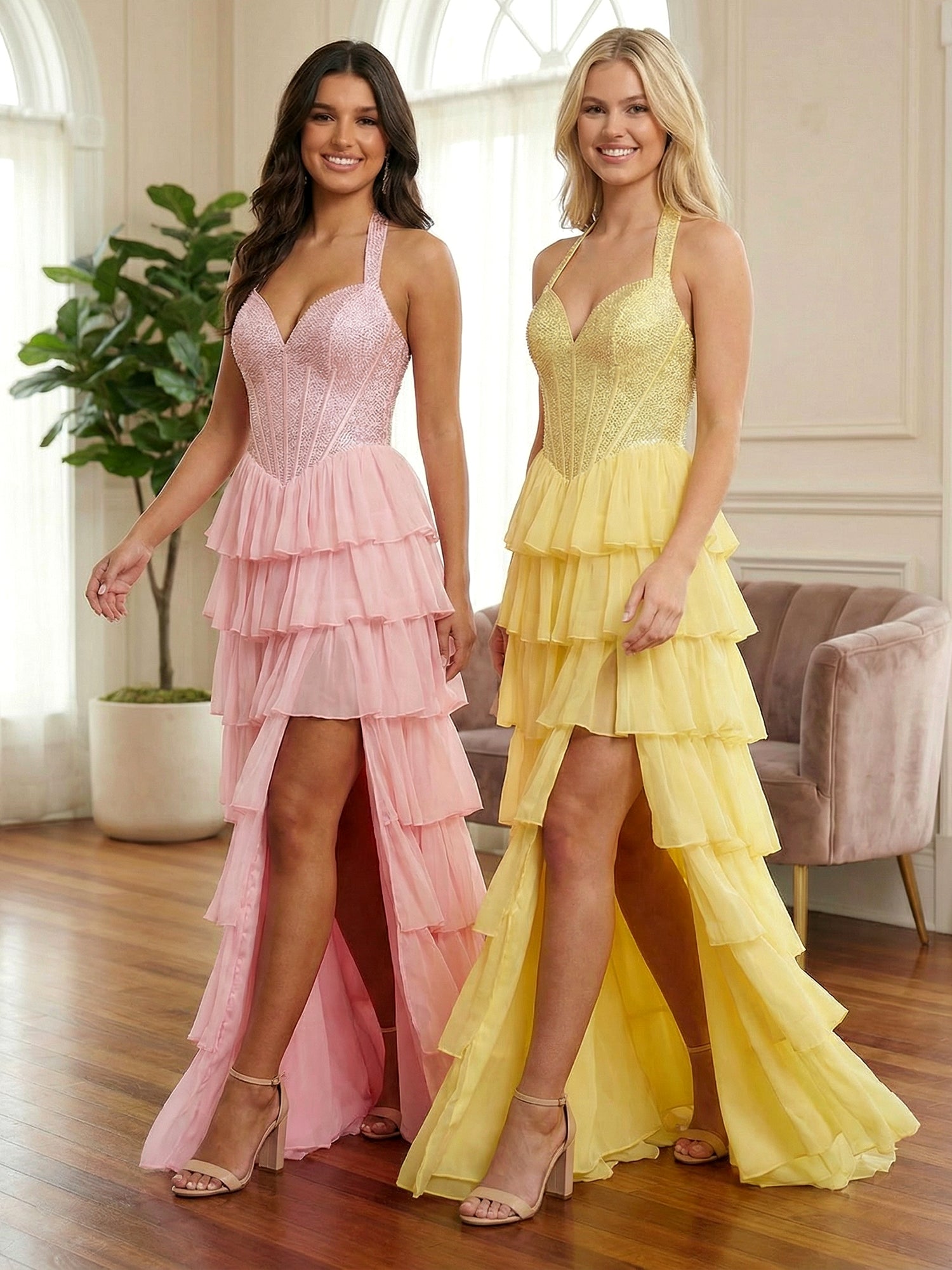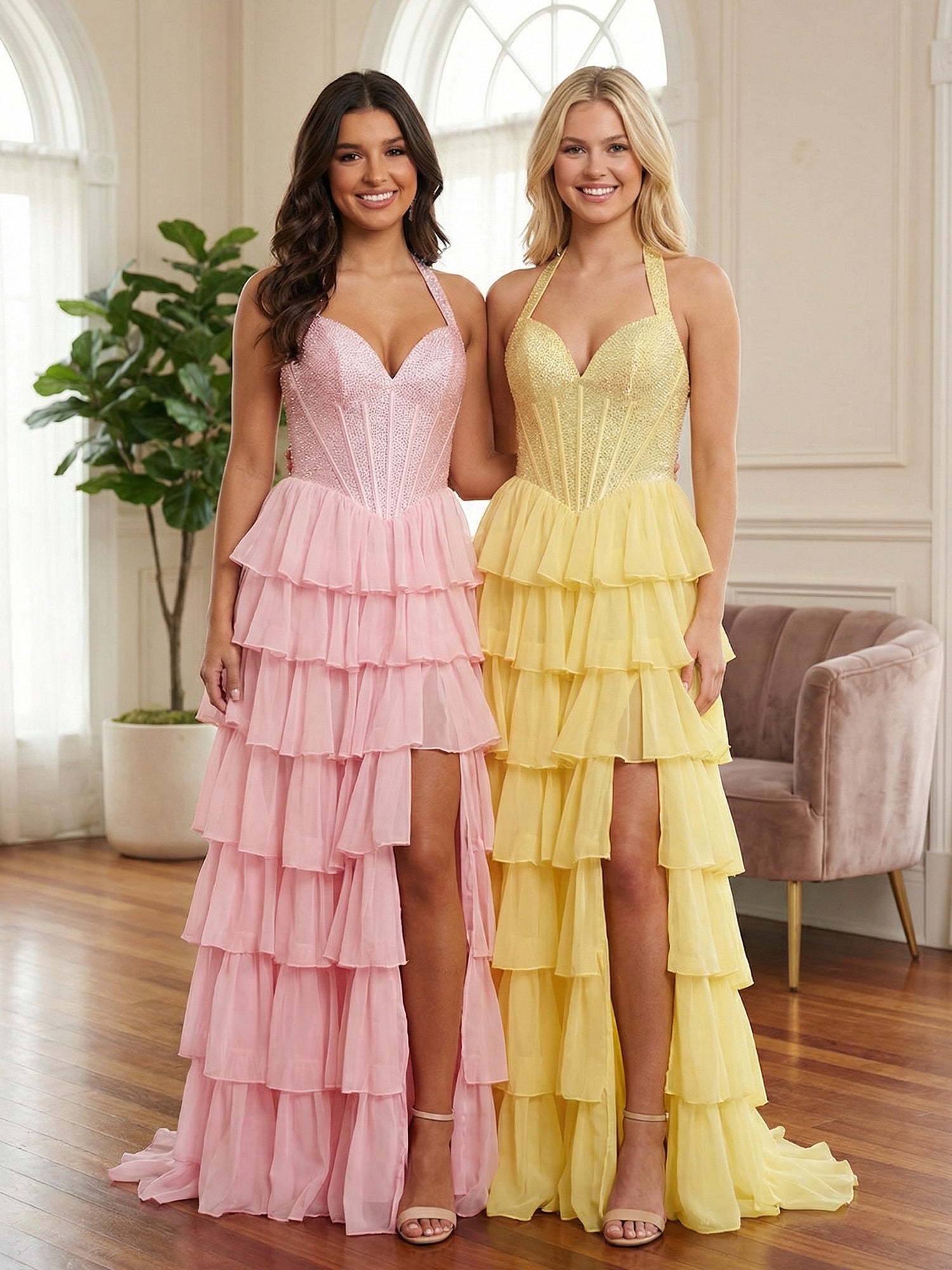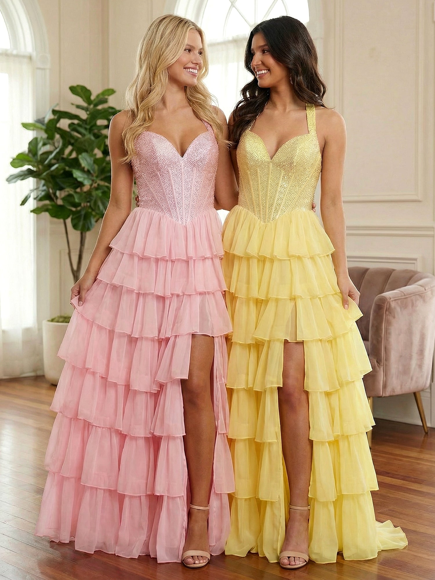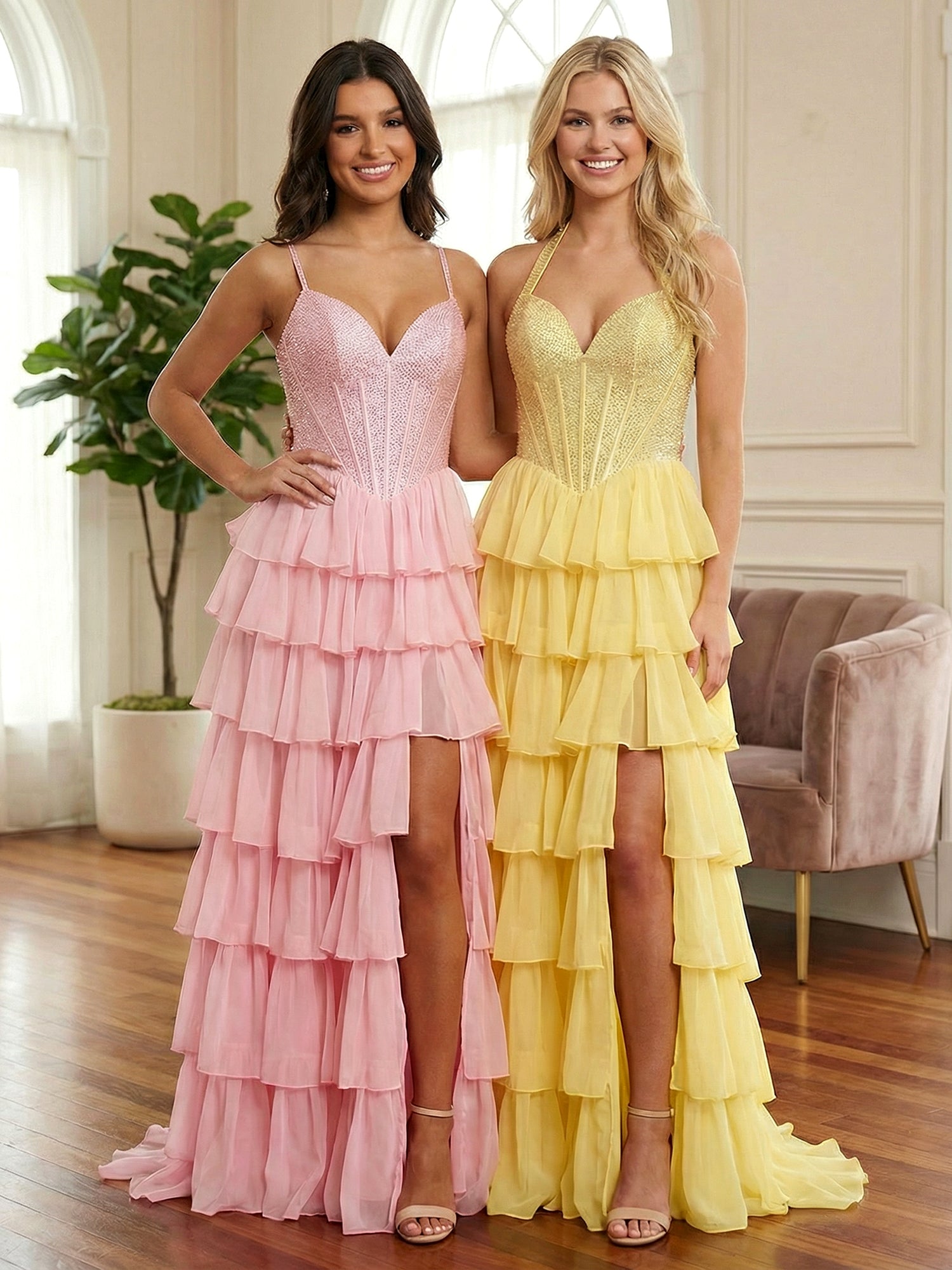 Radiate joy and youthful energy in these spectacular tiered evening gowns, designed to make a vibrant statement on the dance floor. The bodice features a structured sheer corset with visible boning, fully encrusted with matching crystals and beads that shimmer with every turn. The skirt is a dramatic display of volume, crafted from layer upon layer of tiered tulle ruffles that cascade to the floor, creating incredible movement. A daring thigh-high slit cuts through the clouds of tulle, adding a modern edge to the princess-like silhouette. Shown in a soft baby pink with spaghetti straps and a sunny yellow with a halter neckline, this style is perfect for prom or sweet sixteens.