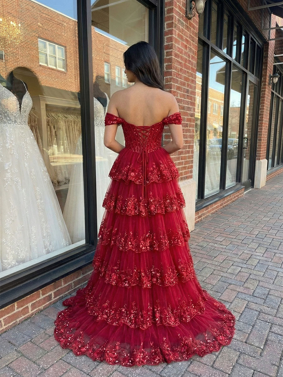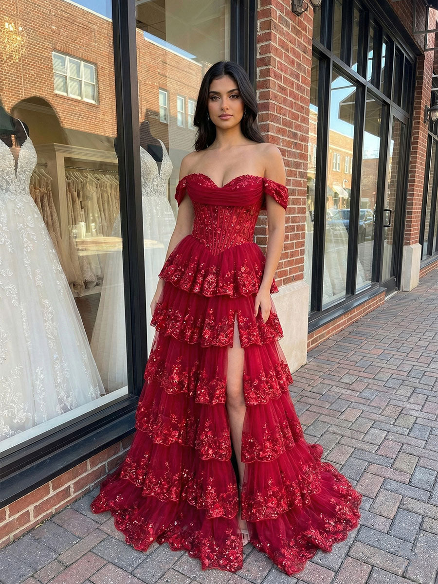 Red Off The Shoulder Tiered Ruffle Corset Prom Dress with Slit