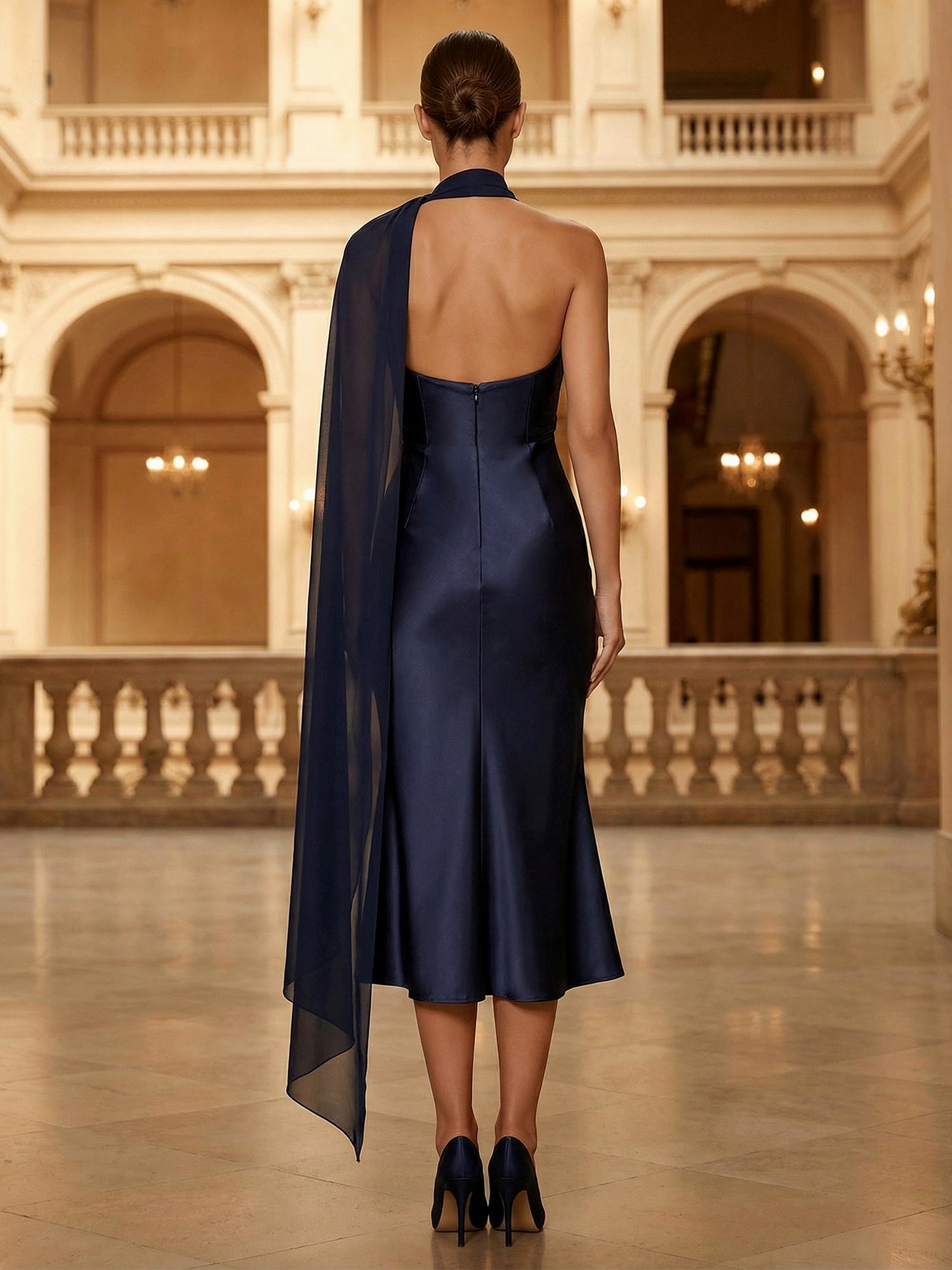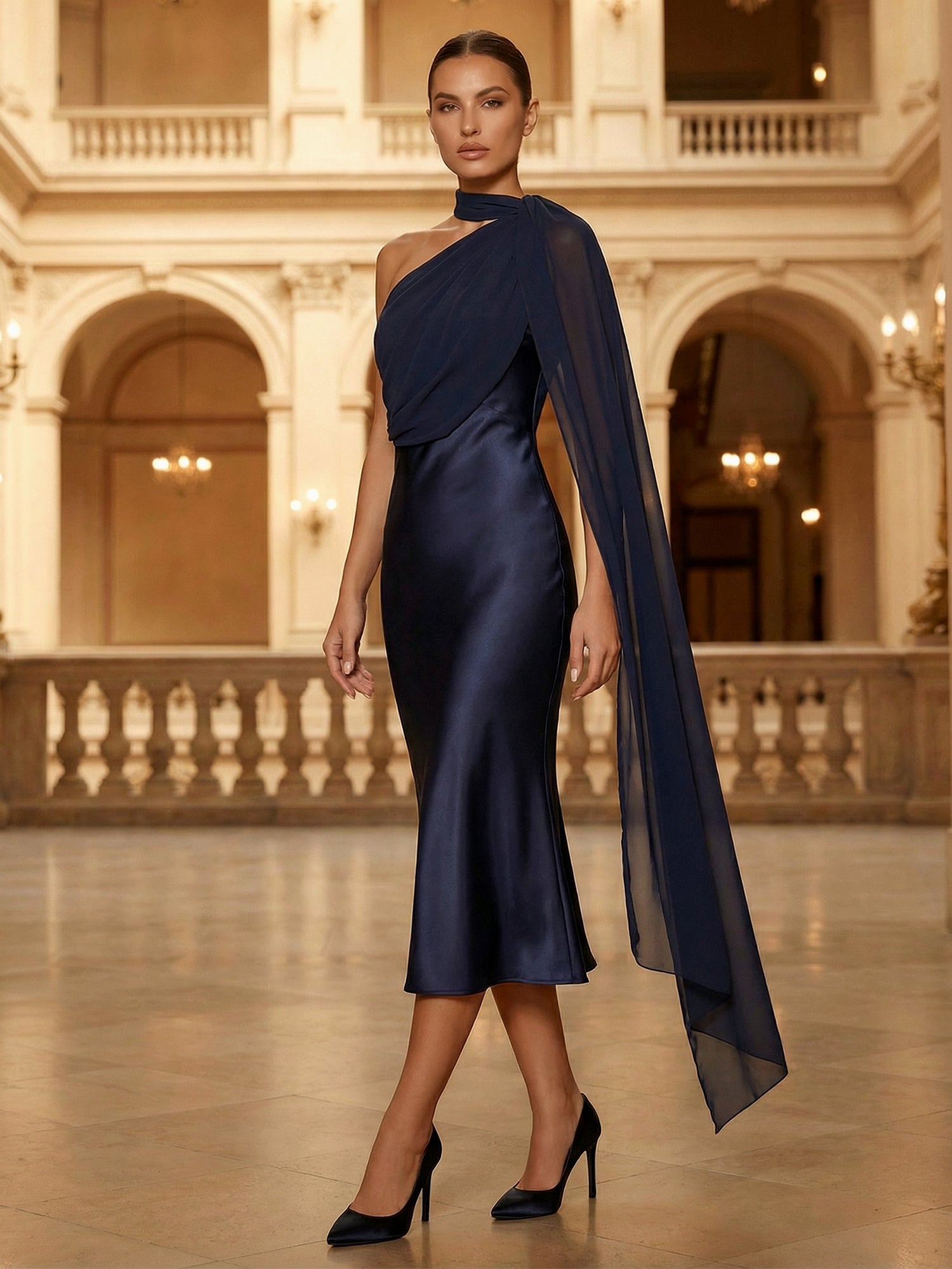 Navy Blue One Shoulder Chiffon Cape Midi Dress Satin Sheath Evening Gown