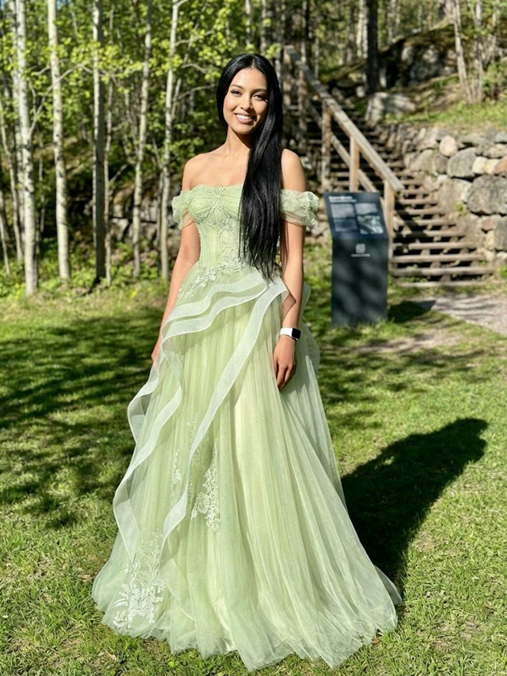 Radiate fairytale elegance in this enchanting light green off-the-shoulder ball gown. The romantic A-line silhouette features a structured corset bodice adorned with delicate lace appliqués and shimmering beadwork, creating a dreamy and ethereal look. Soft tulle off-shoulder sleeves drape gracefully over the arms, while layered organza ruffles cascade from the waist, adding volume and whimsical movement. The full tulle skirt flows effortlessly to the floor, detailed with embroidered floral accents that glimmer subtly in the light. Perfect for prom, galas, or any evening you wish to feel like royalty.