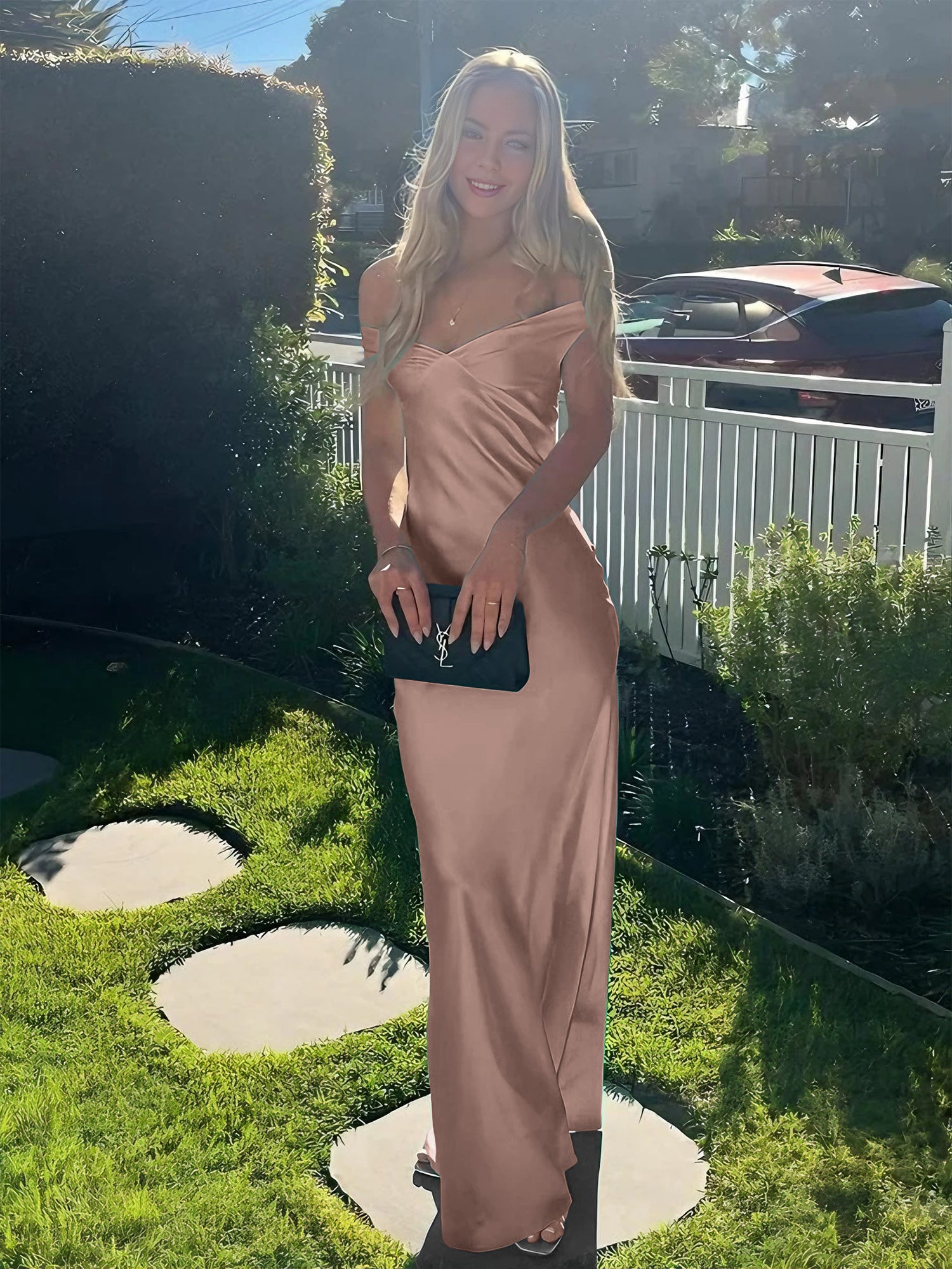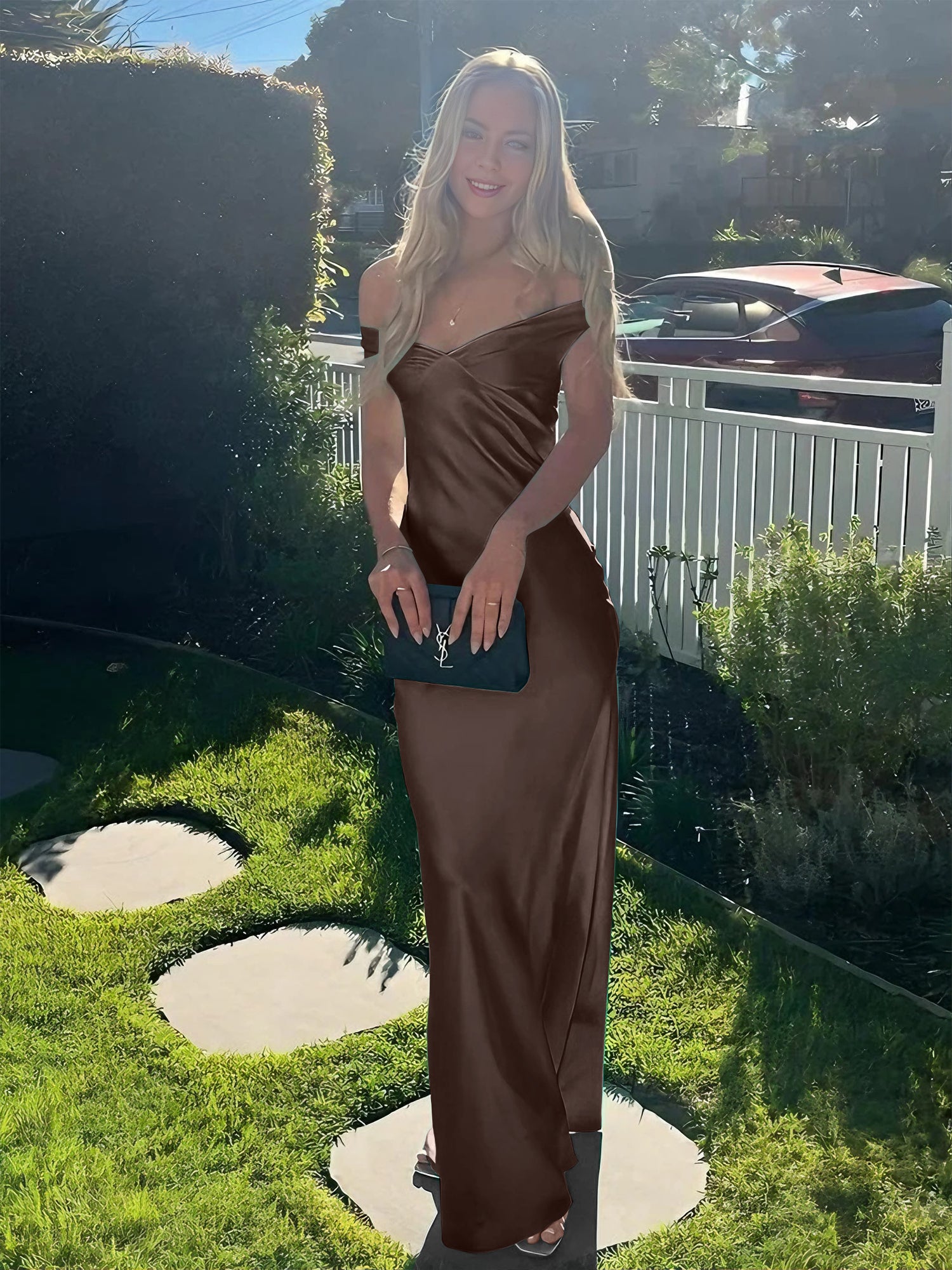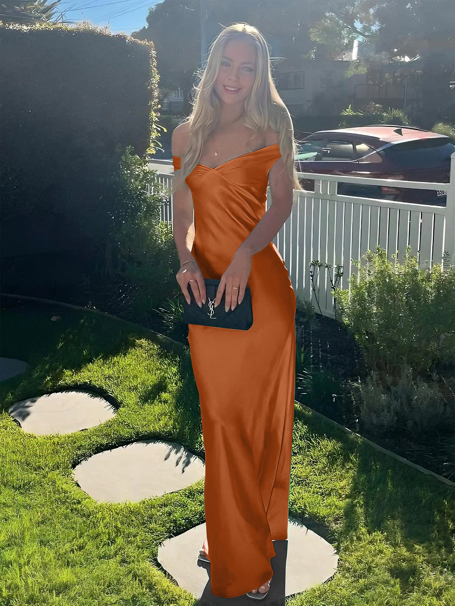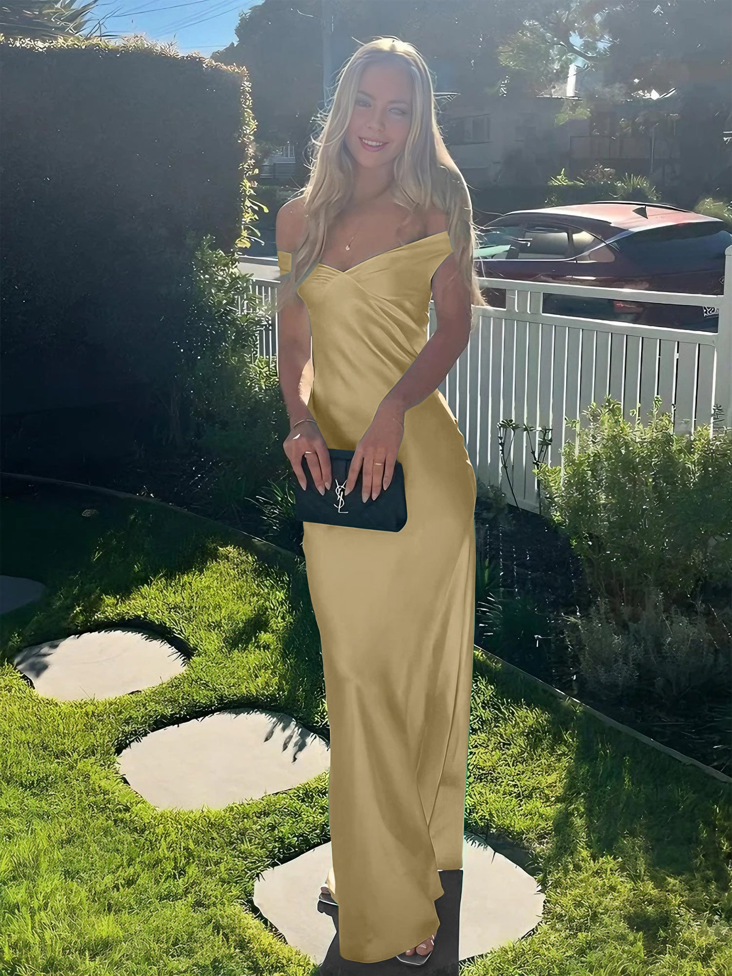 Effortlessly chic and undeniably elegant, this satin gown is the perfect blend of sophistication and modern charm. The off-the-shoulder neckline drapes gracefully, accentuating the collarbone while adding a touch of romance. Designed to hug the figure beautifully, the sleek silhouette flows into a floor-length hem, creating an effortlessly refined look. The soft, lustrous satin fabric catches the light with every movement, making this gown a stunning choice for proms, evening soirées, or any special occasion where timeless elegance is a must.