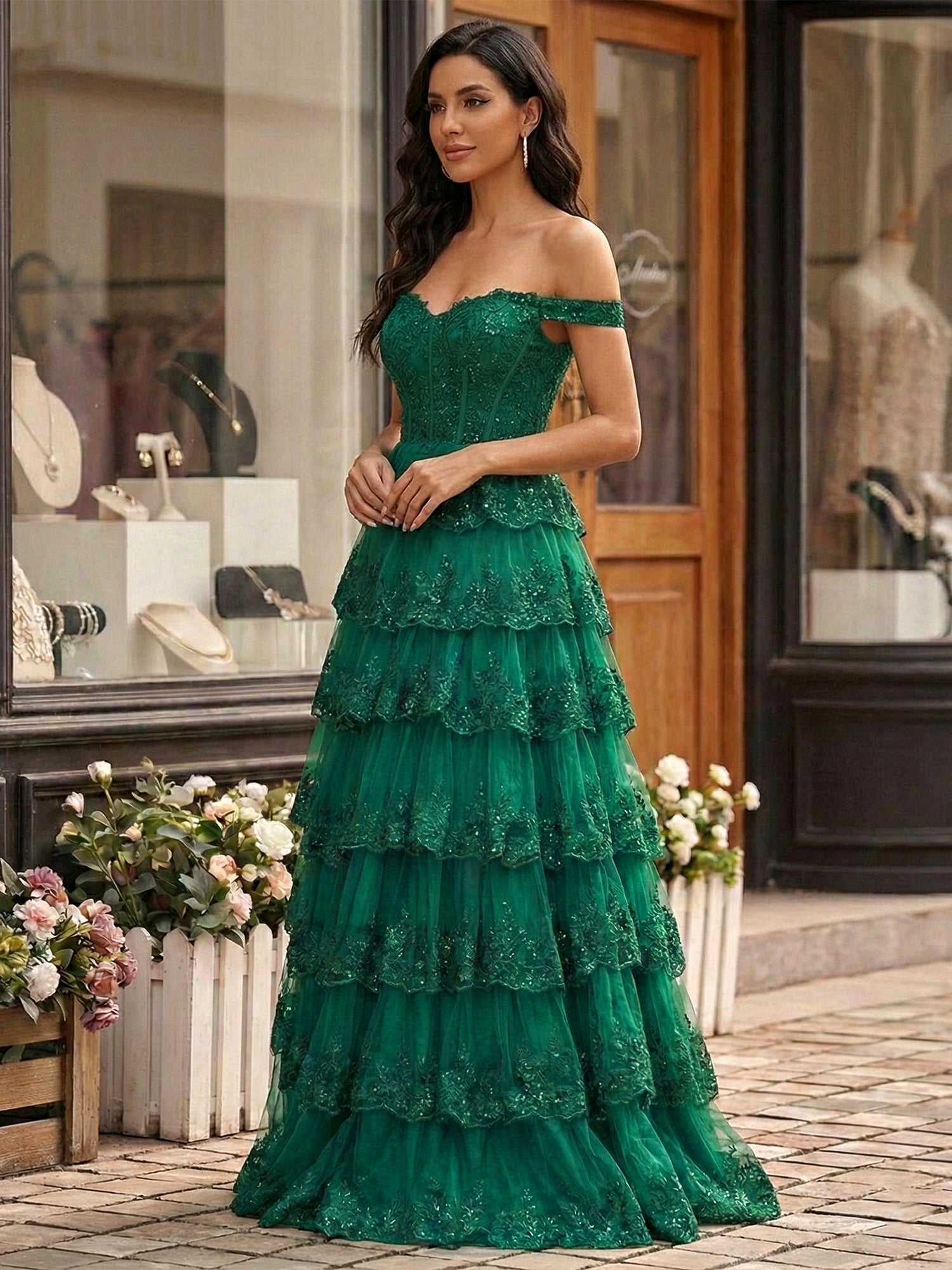 Exude royal elegance in this breathtaking emerald green prom gown, designed to make a commanding statement at any formal event. The bodice features a romantic off-the-shoulder sweetheart neckline with sheer straps that drape gracefully over the arms. A structured corset bodice with visible boning is overlaid with intricate floral lace embroidery that trickles down past the waist. The skirt is a dramatic masterpiece of volume, crafted from layers of tulle arranged in cascading tiers, each edged with matching lace appliqué for a rich, textured look. The deep forest green hue adds a sense of mystery and sophistication, making this gown perfect for winter galas, black-tie weddings, or a show-stopping prom entrance.