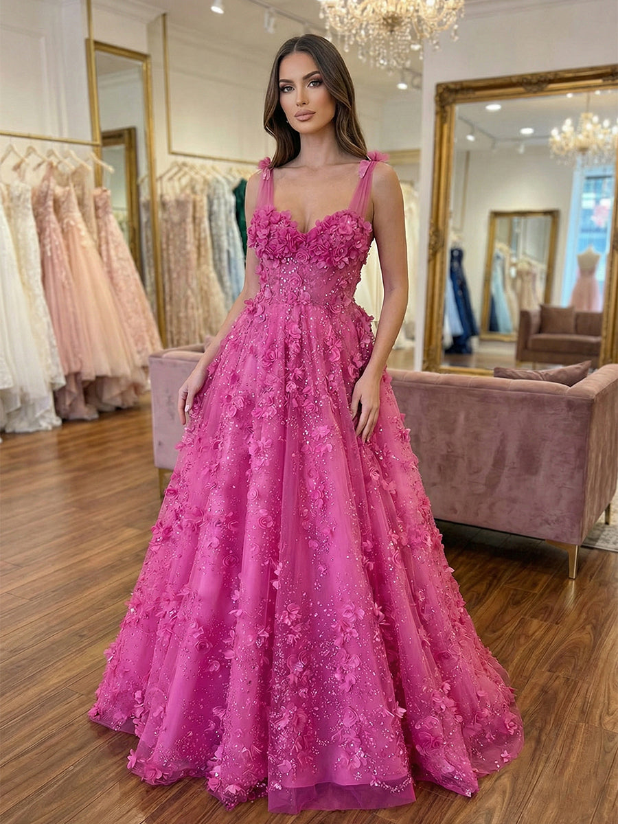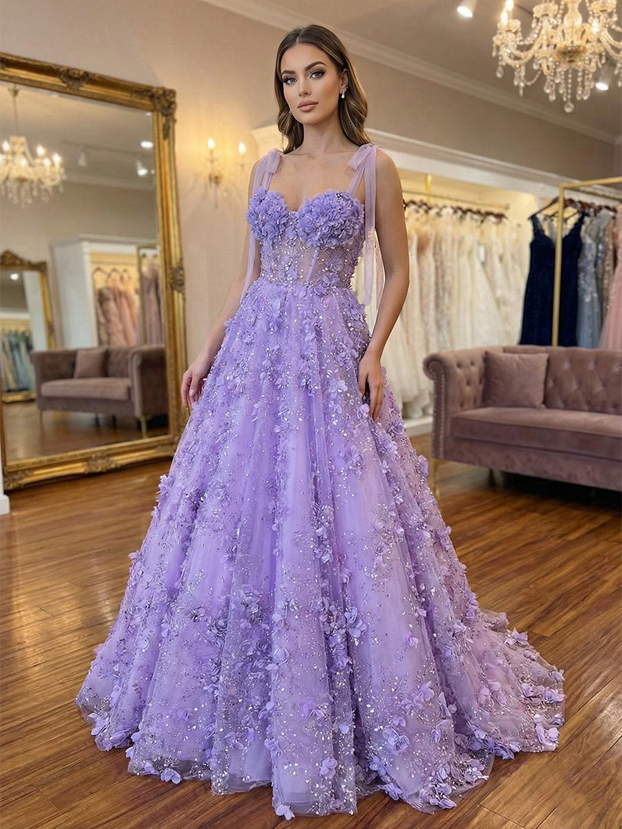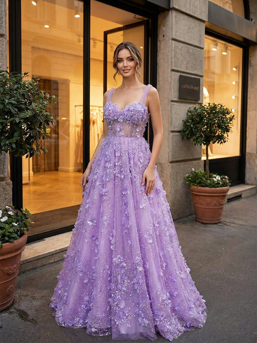 Step into an enchanted garden in this breathtaking lilac ballgown, a magical addition to the Dreamylily collection designed for the woman who loves romantic, fairycore elegance. The bodice features a flattering sweetheart neckline supported by wide, tulle straps adorned with delicate floral details. A trendy sheer corset design with visible boning perfectly sculpts the waist, covered in a spectacular array of 3D floral appliqués and shimmering beads that catch the light from every angle. Crafted from layers of airy tulle, the voluminous A-line skirt creates a classic fairytale silhouette, with the intricate 3D flowers and sparkling accents cascading beautifully from the waist down to the floor. Perfect for a memorable prom, a sweet 16, or a whimsical spring formal.