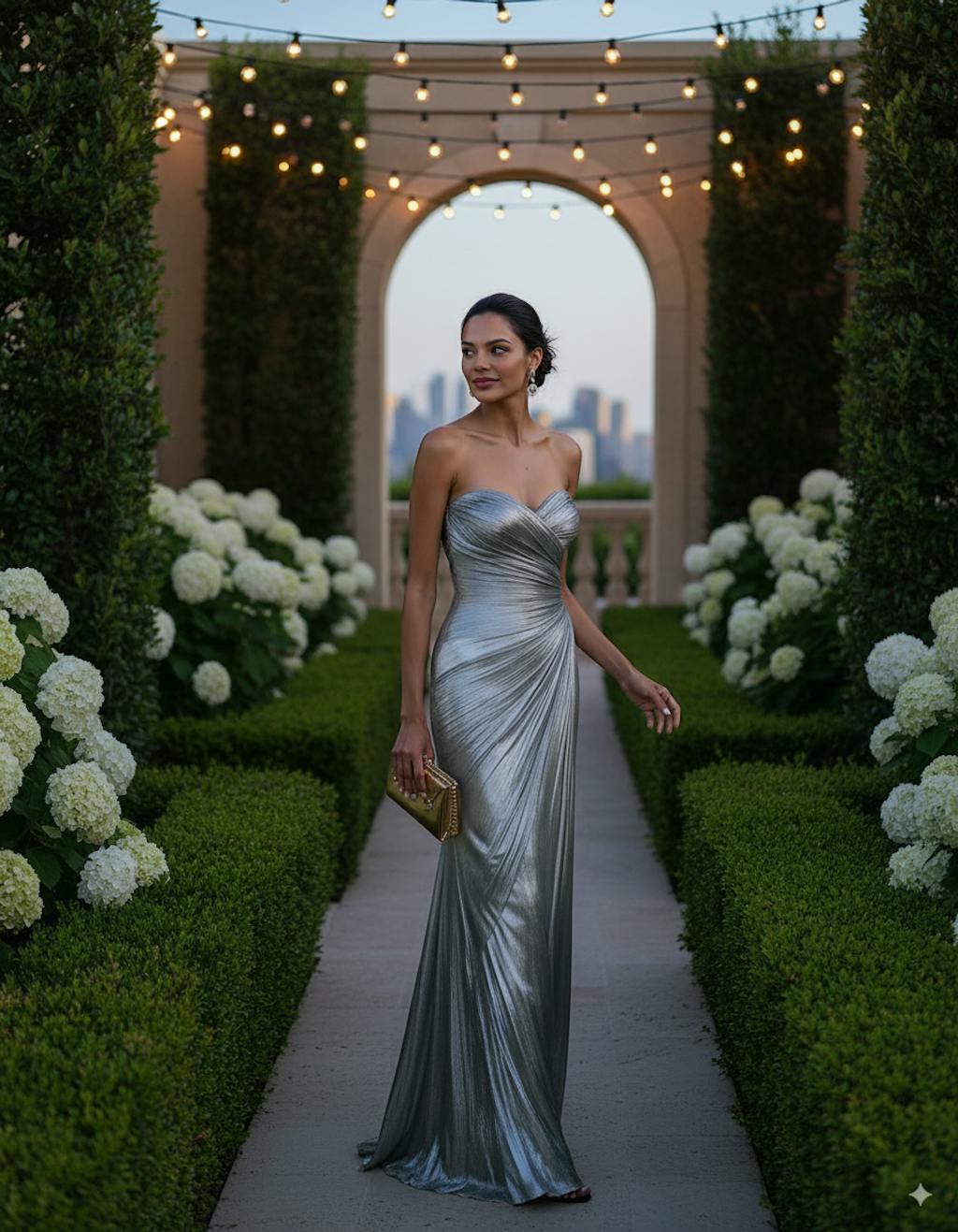Command attention in this breathtaking metallic silver evening gown. Designed with a sweetheart strapless neckline and intricate pleated detailing, this floor-length dress drapes flawlessly to create a statuesque silhouette. The ruched bodice cinches the waist, while the flowing skirt adds graceful movement with every step. Perfect for black-tie events, galas, red carpet occasions, or any moment you want to shine with undeniable elegance.