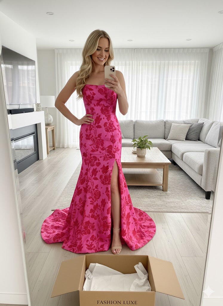 This is pure, high-impact glamour. This stunning ballgown is crafted from a rich, structural jacquard or brocade fabric, which features a gorgeous, textured floral pattern woven throughout. The dress has a clean, classic, strapless neckline and a fitted bodice that flows into a full, voluminous A-line skirt. And, because the 21st century is wonderful, it has hidden side pockets. It's the perfect blend of timeless elegance and modern practicality.