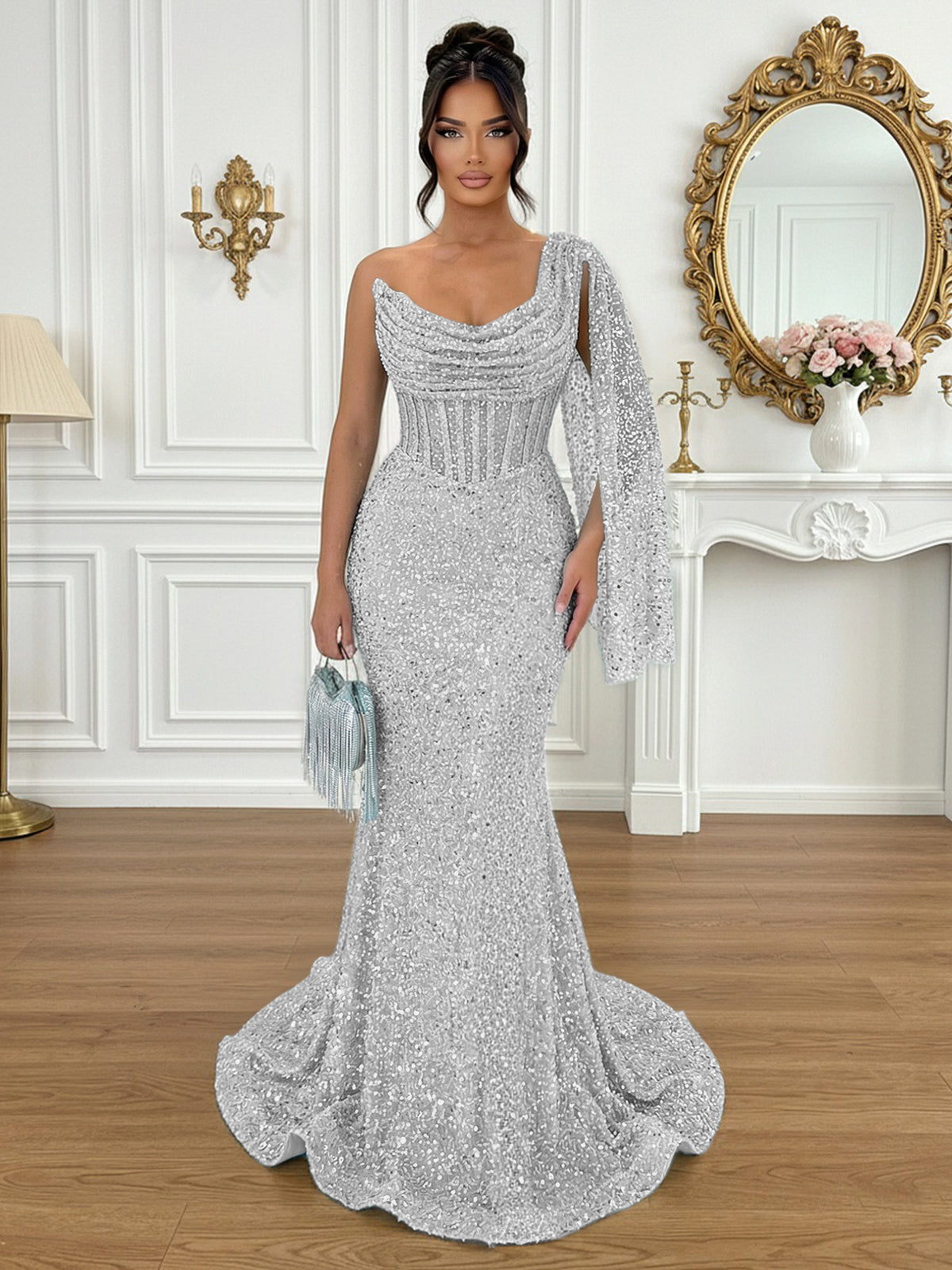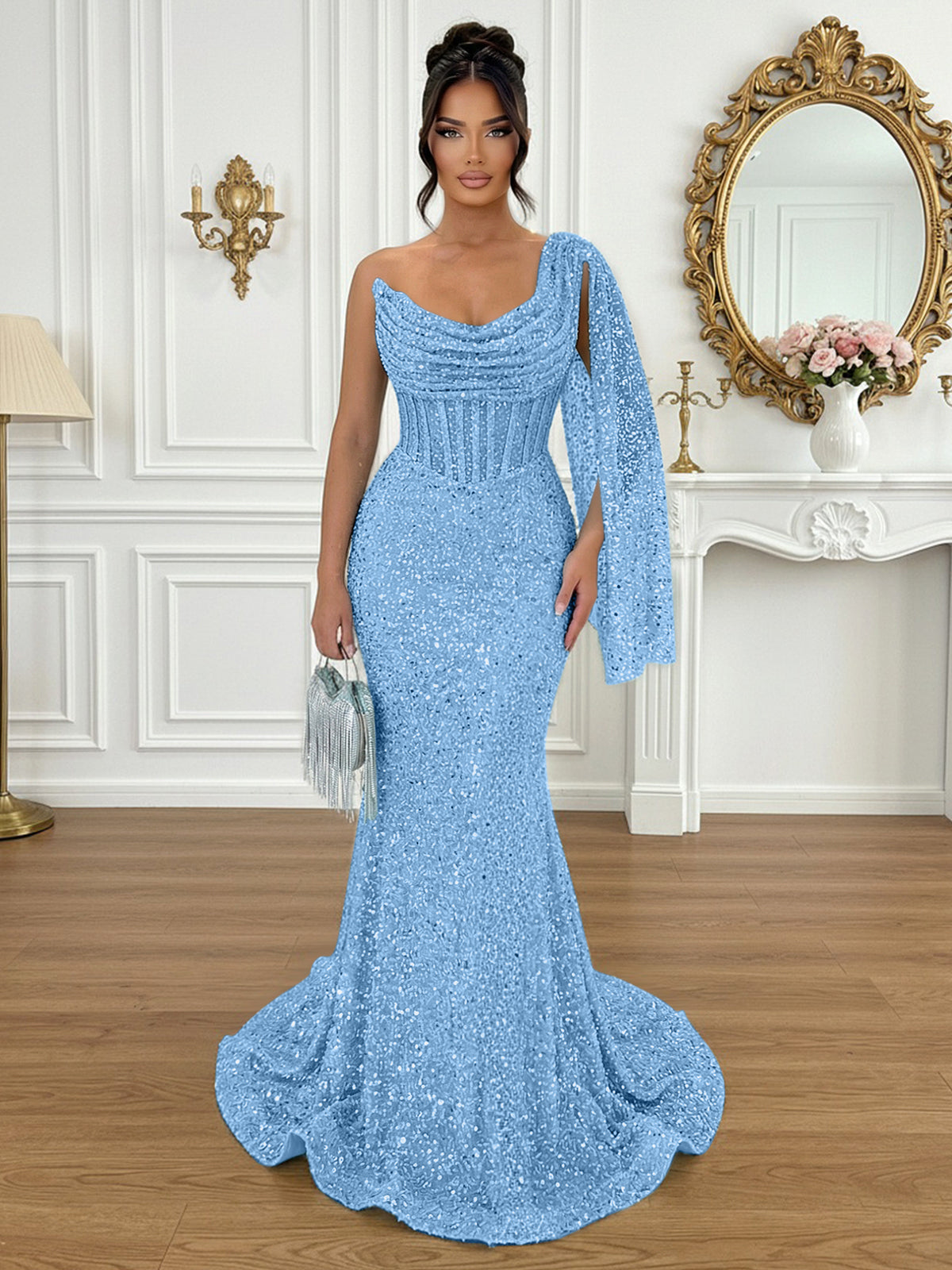 Glamorous Ice Blue One-Shoulder Sequin Corset Mermaid Prom Dresses