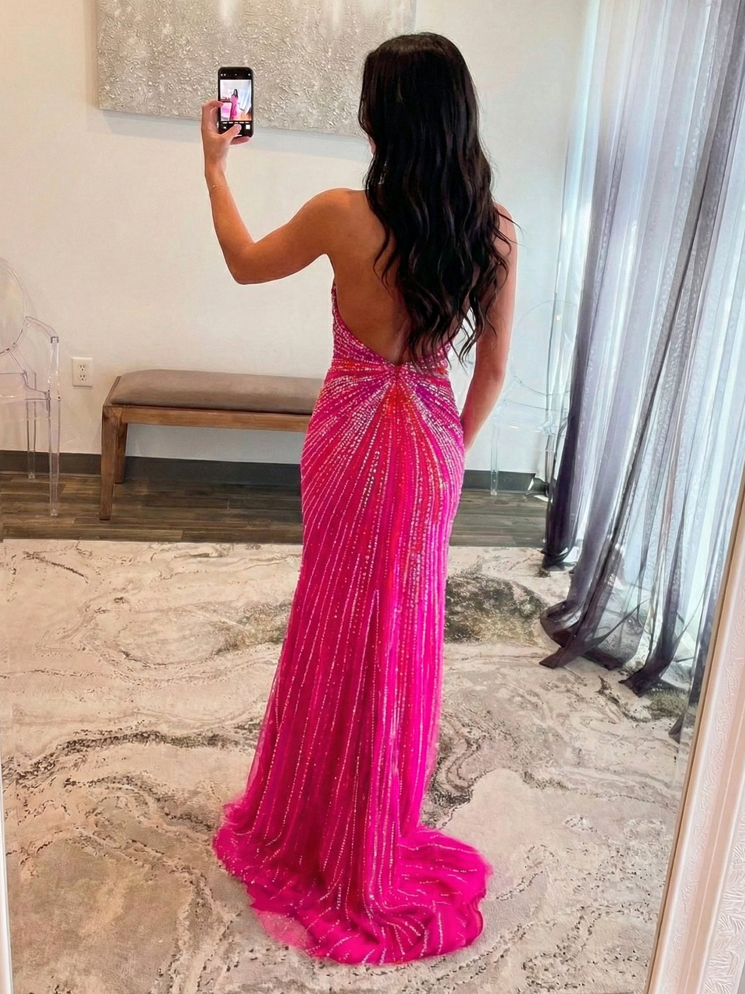 Unleash your inner pop star in this sensational hot pink evening gown, designed for the girl who brings the energy and color to every room. The bodice features a daring plunging V-neckline in a halter style, creating a sultry and elongated silhouette that highlights the shoulders and neckline. The gown is a masterpiece of beadwork, featuring an explosive sunburst or radial pattern of shimmering pink and iridescent beads that originate from the waist and shoot outward, sculpting the figure with light and texture. The fitted column skirt hugs the curves before releasing into a soaring thigh-high slit, adding a final touch of drama and allowing for effortless movement on the dance floor. Perfect for a pageant, a neon-themed prom, or a high-voltage red carpet appearance.