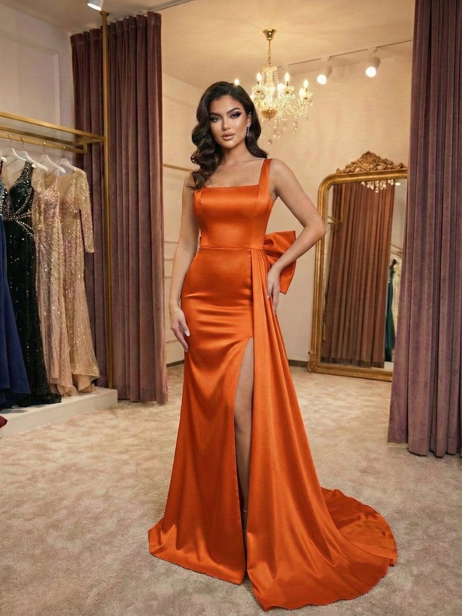 Achieve a look of pristine elegance with this ivory satin prom gown, defined by its clean lines and modern architectural details. The bodice features a chic square neckline and wide straps, offering a structured and sophisticated fit. A dramatic high leg slit adds a touch of daring to the floor-length skirt, while a large, sculptural bow positioned at the hip serves as a stunning statement piece. The skirt extends into a graceful train, ensuring a majestic exit.