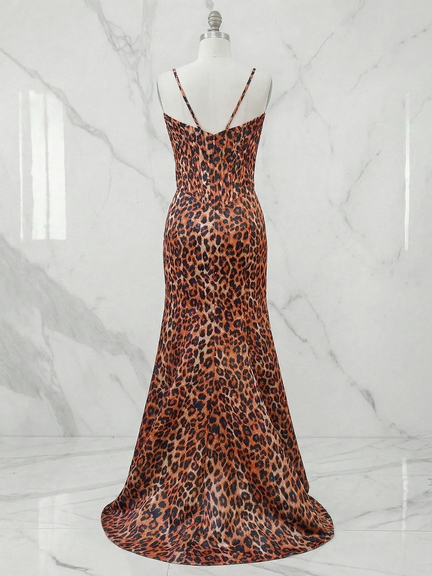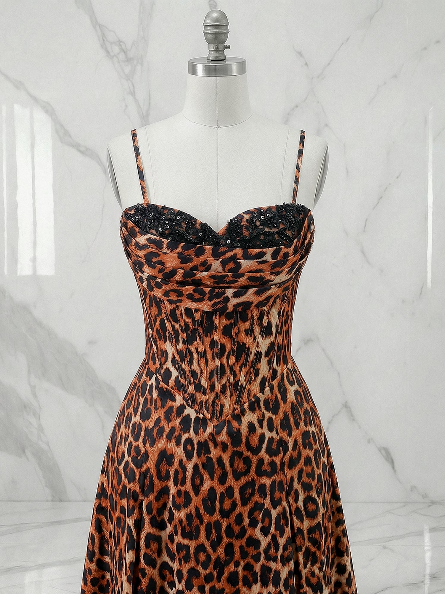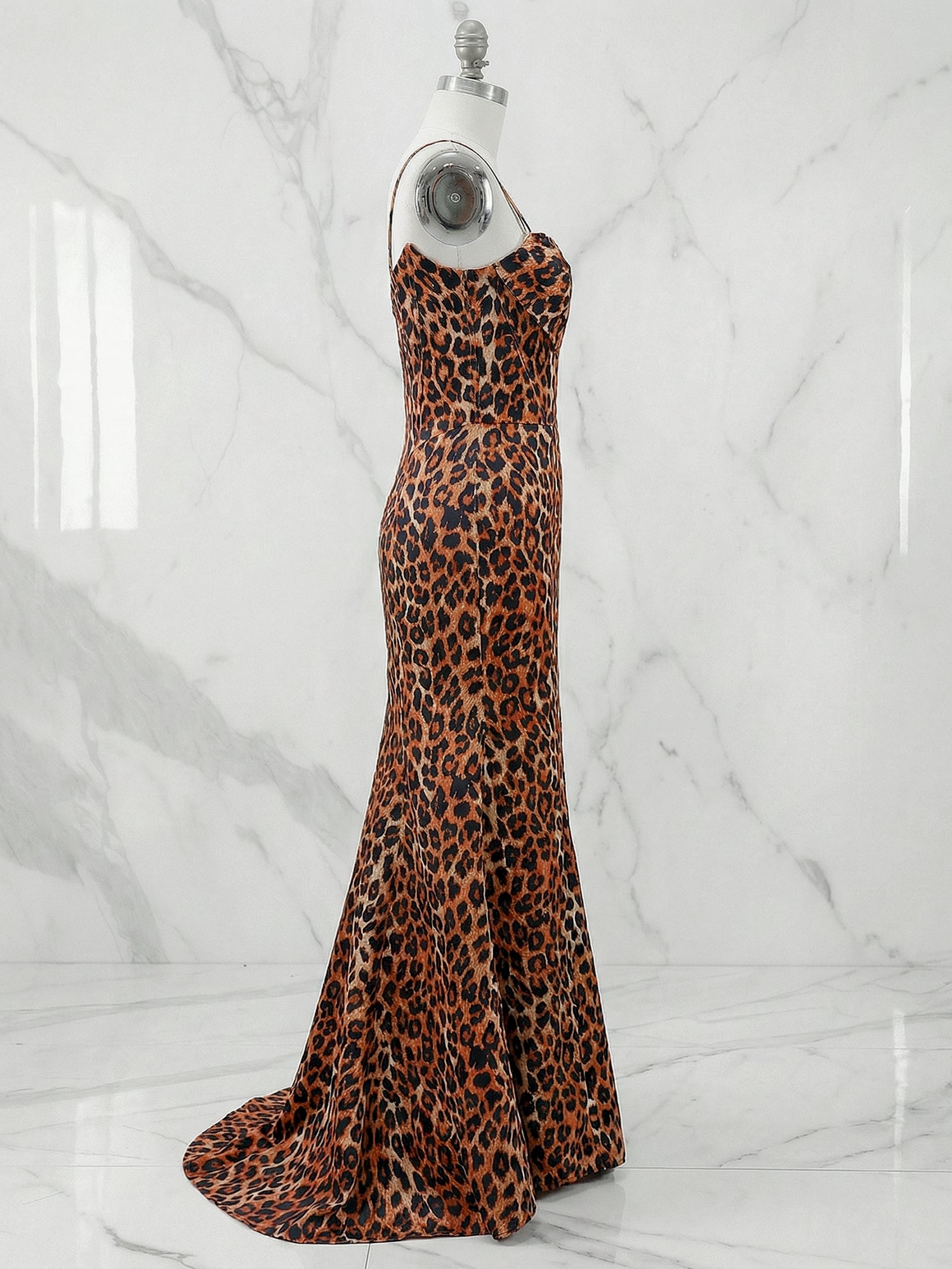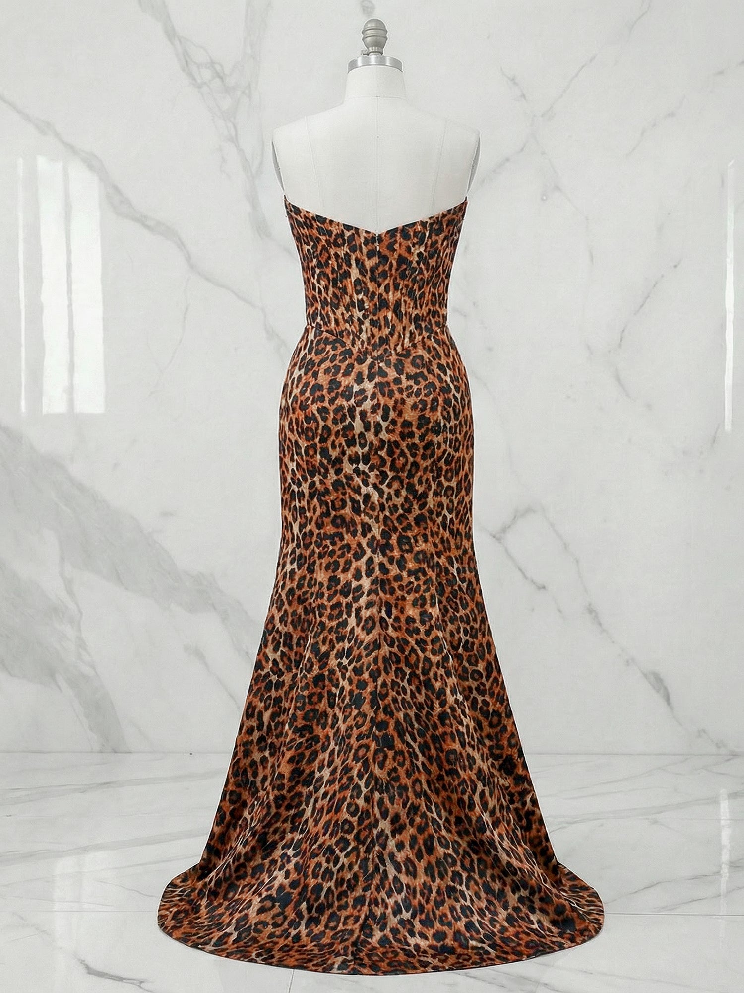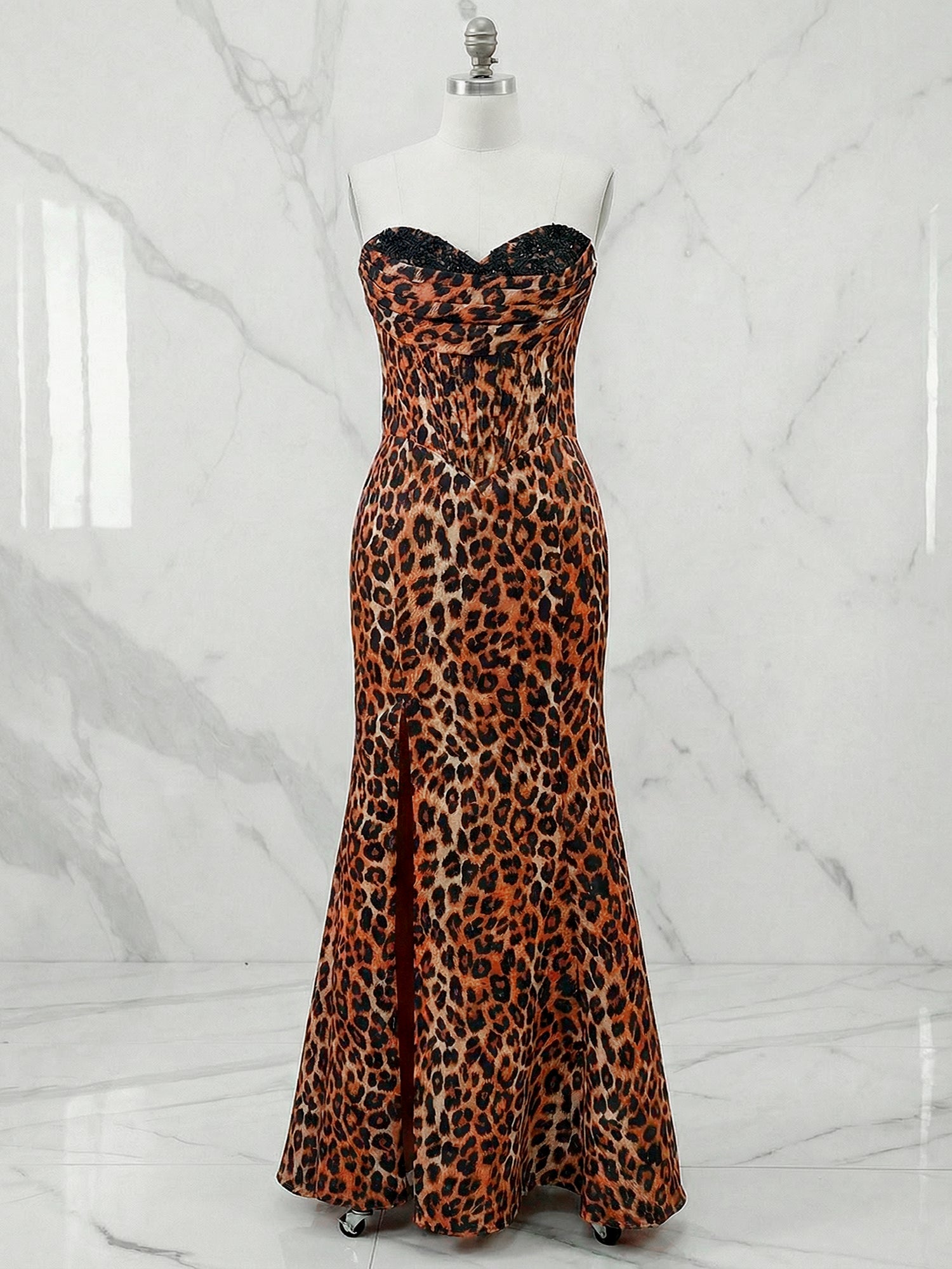 Exude pure glamour in this stunning leopard print prom gown, designed to command attention with its bold pattern and sultry silhouette. The figure-hugging mermaid style is perfected with a structured corset bodice, featuring visible boning for a sleek and defined fit. The strapless sweetheart neckline is heavily adorned with dazzling beadwork and rhinestones that sparkle under the light, drawing the eye upward. The skirt hugs your curves through the hips before flaring out gracefully to the floor, creating a dramatic and sophisticated look. Perfect for formal galas, proms, or red-carpet events, this gown ensures you make a memorable entrance, feeling confident and luxurious.