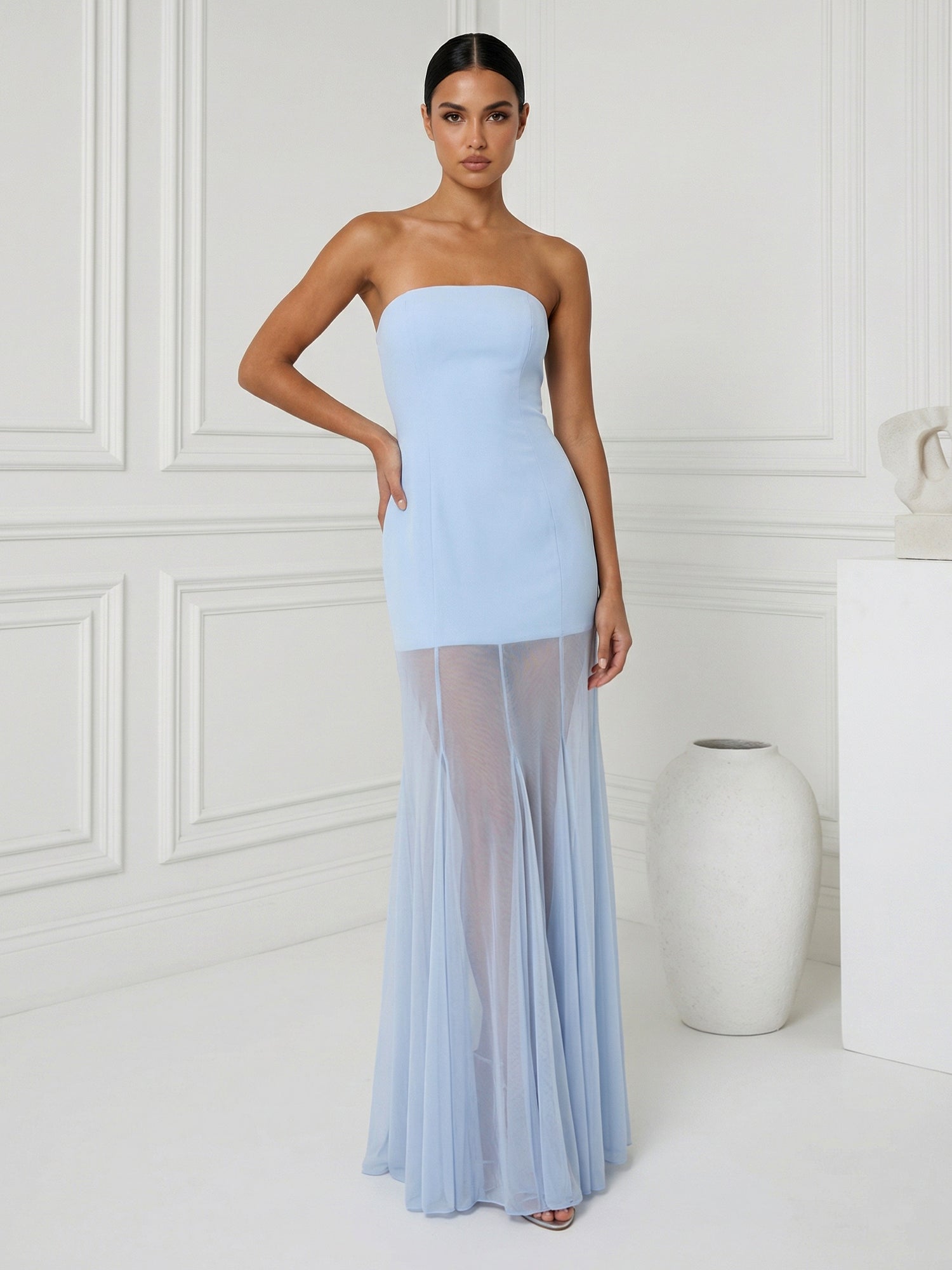 Light Blue Strapless Mermaid Chiffon Maxi Dress with Pleat