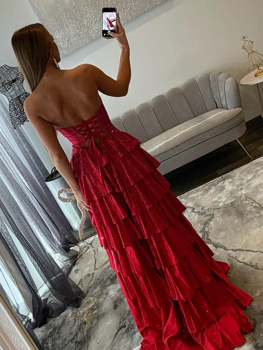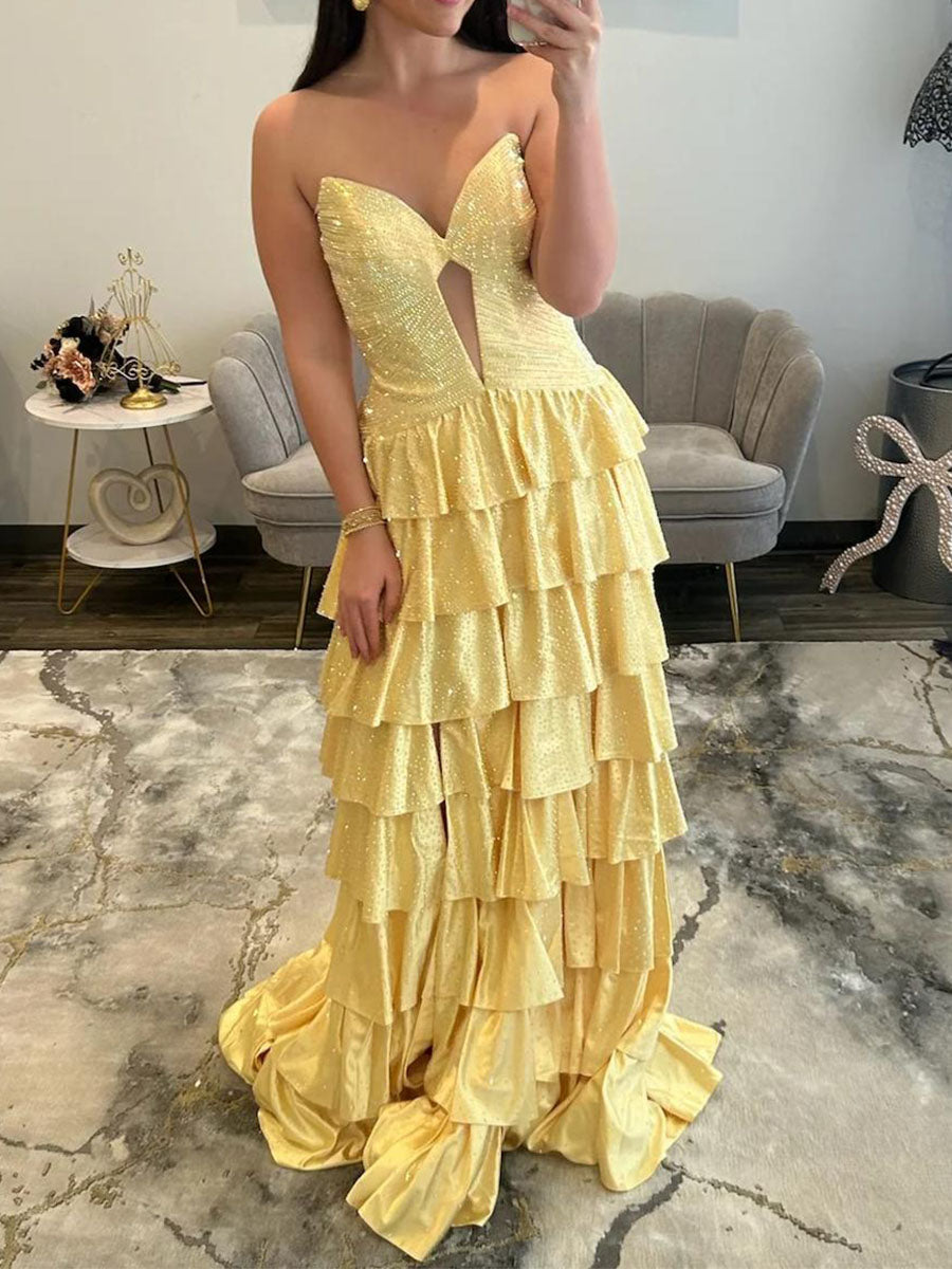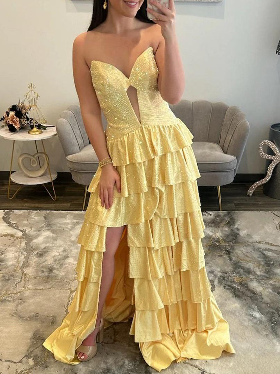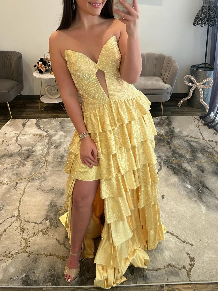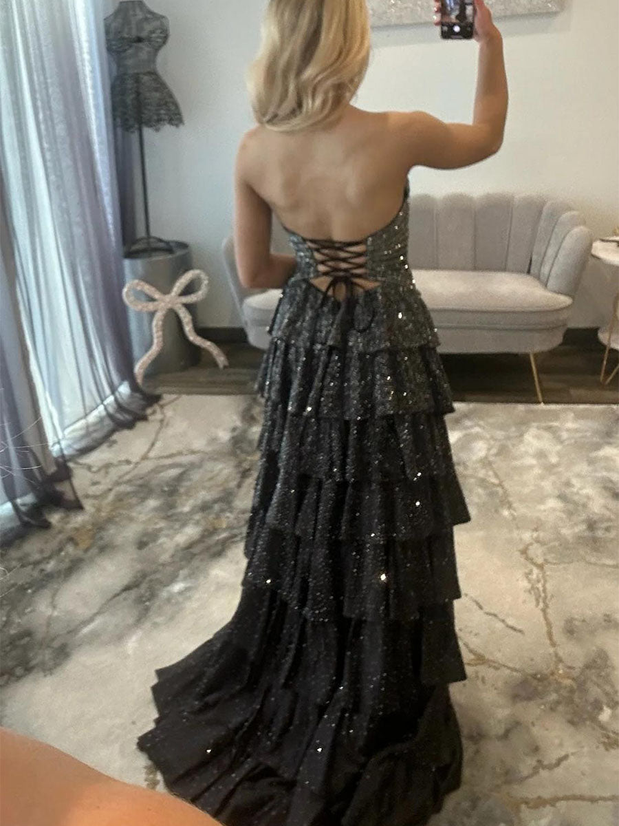 Embrace your inner party princess in this fun and flirty light pink prom gown, designed for the girl who loves movement and sparkle. The bodice features a trendy strapless sweetheart neckline with a daring keyhole cutout at the center, adding a modern and edgy touch to the sweet silhouette. The entire gown is crafted from a shimmering, glitter-infused fabric that catches the light from every angle. The true standout feature is the skirt, which is composed of multiple horizontal tiers of ruffles that cascade down to the floor, creating playful volume and bounce as you walk or dance. A soaring thigh-high slit cuts through the tiers, ensuring the look remains youthful and not too heavy. Perfect for prom, a sweet sixteen, or any festive celebration where you want to twirl the night away.
