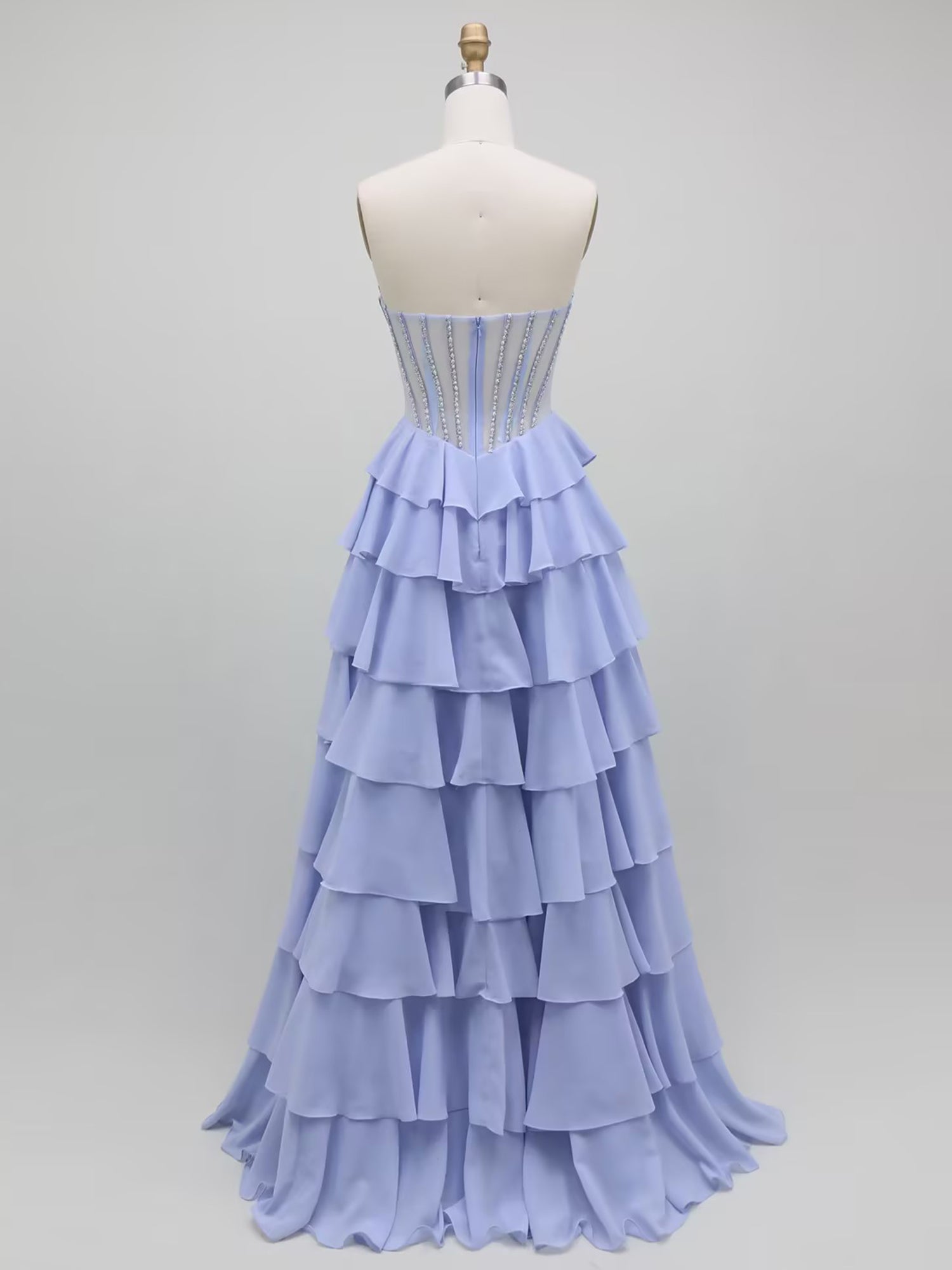 Float onto the dance floor in this enchanting lilac evening gown, designed to blend ethereal softness with trendy structure. The bodice features a fashionable sheer corset with visible boning, embellished with vertical lines of shimmering crystals that elongate the torso. A soft, gathered cowl drape gently overlays the strapless neckline, adding a touch of romantic elegance to the structured top. The skirt is constructed from layers of opaque tiered ruffles (likely chiffon or georgette) that cascade to the floor, creating a smooth, fluid volume that differs from the stiffness of tulle. Perfect for sweet sixteens, spring proms, or pastel-themed weddings.