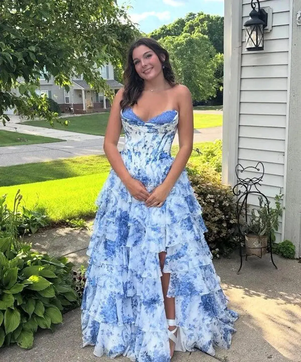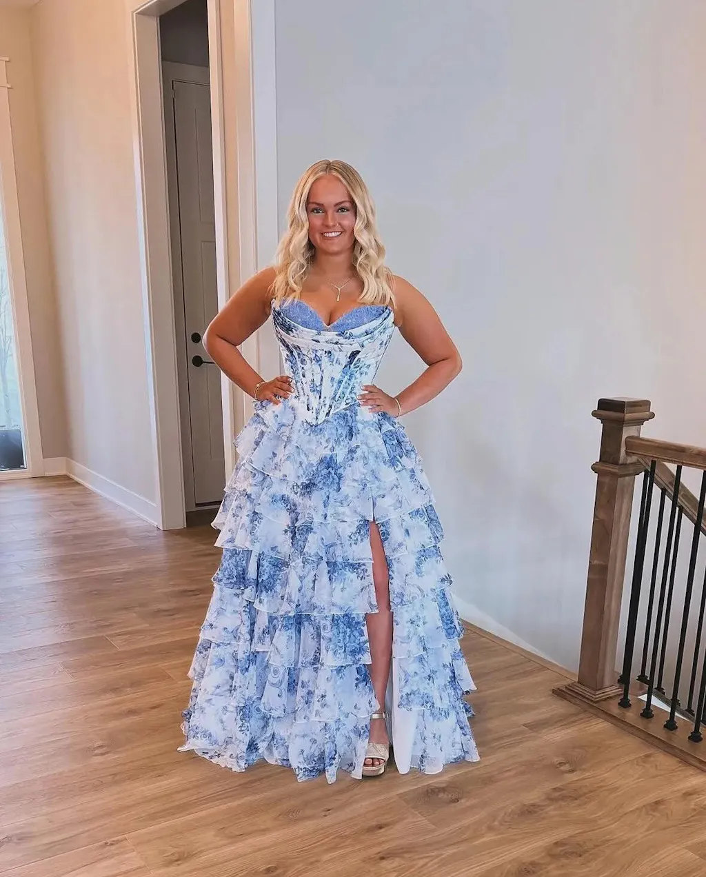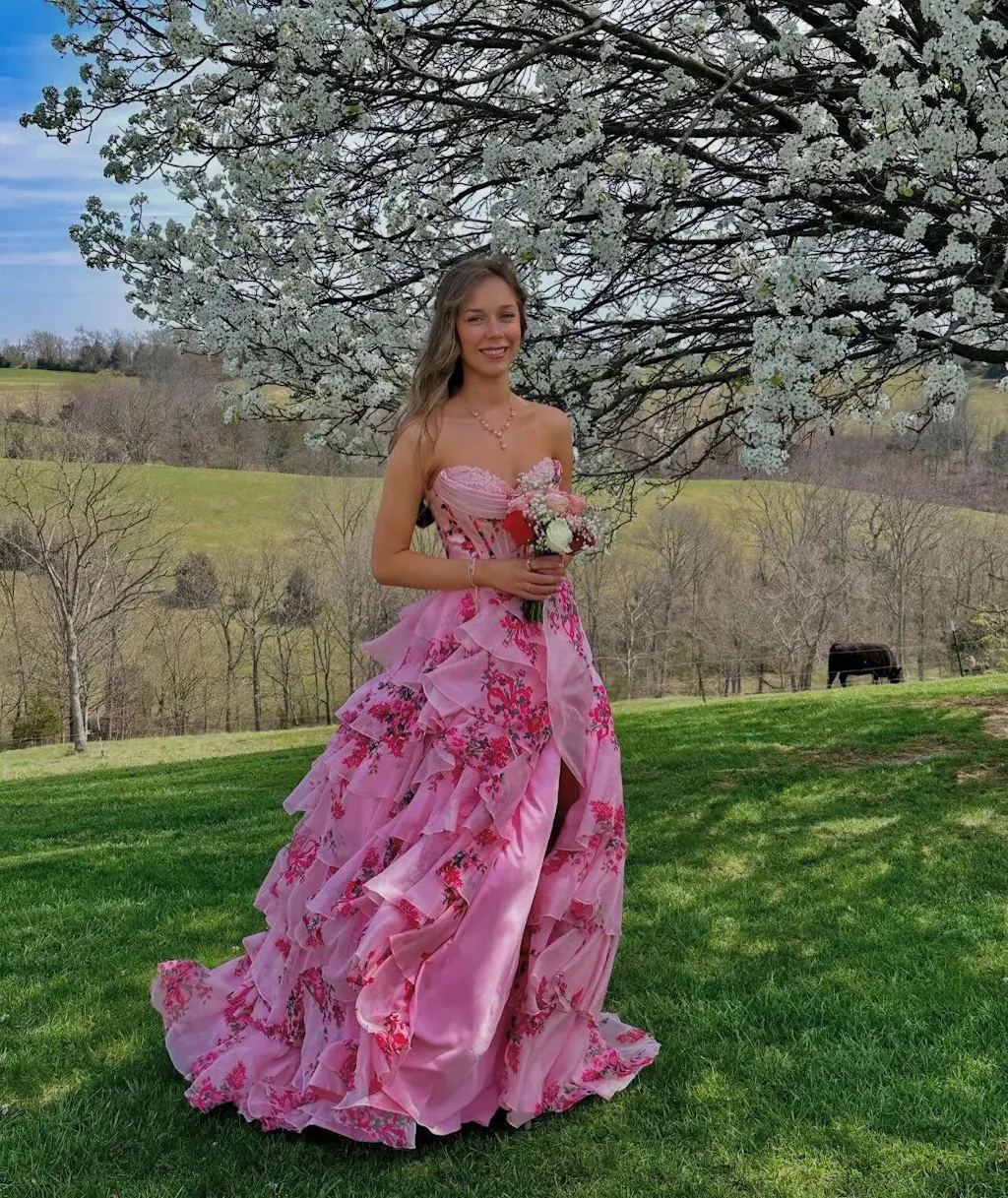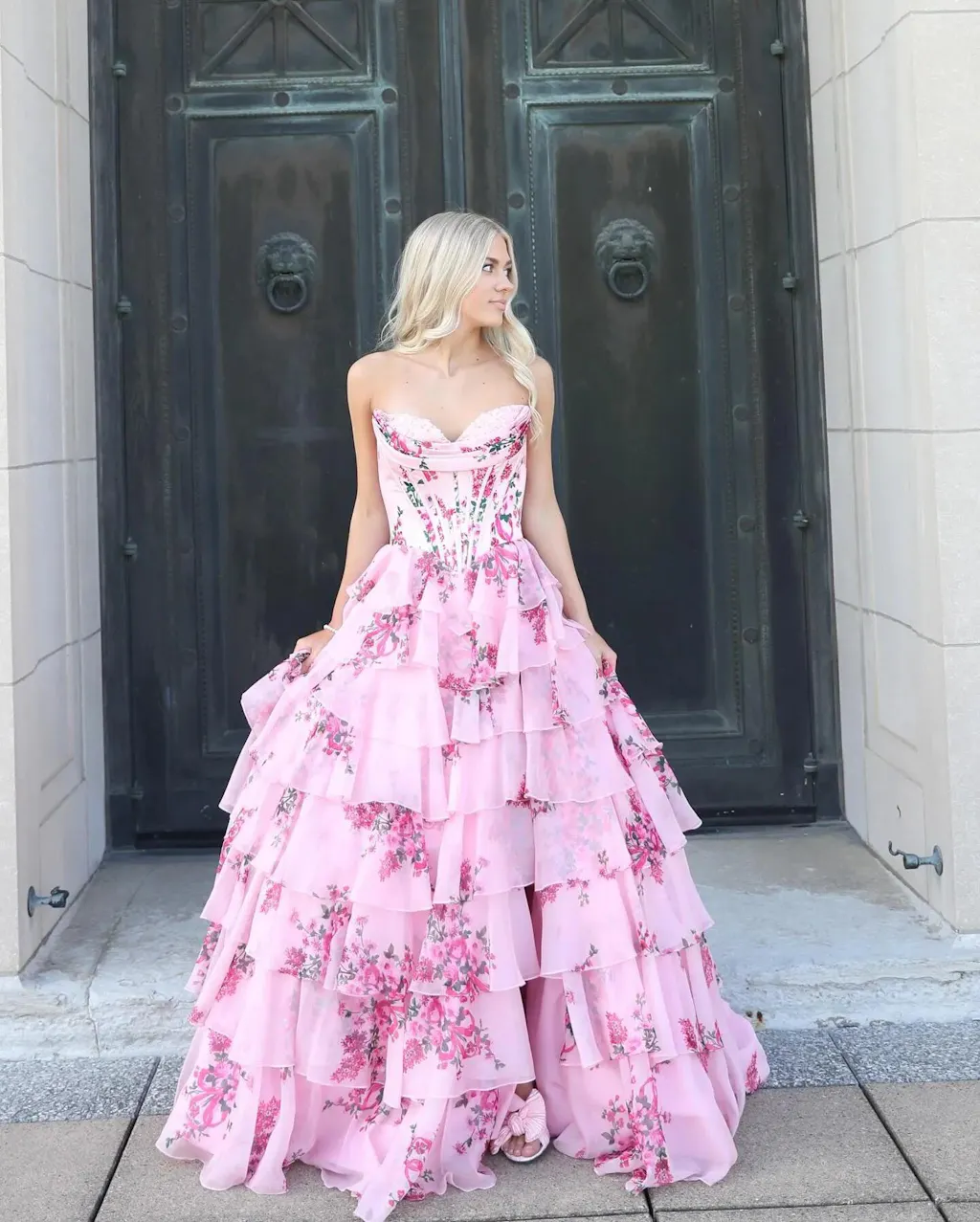 Step into a garden of dreams with this enchanting pink ball gown, adorned with delicate floral patterns. The dress features a strapless sweetheart neckline that beautifully frames the décolletage, leading into a corset-style bodice that cinches at the waist, enhancing your silhouette. The voluminous skirt is a vision of layered ruffles, each tier cascading gracefully to the floor, creating a whimsical and romantic effect. Perfect for fairy-tale weddings, garden parties, or any special occasion where you wish to embody the essence of springtime elegance, this gown ensures you'll captivate with its floral beauty and layered charm.