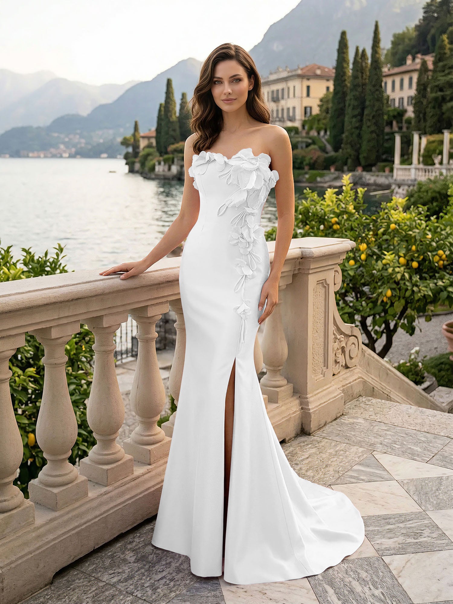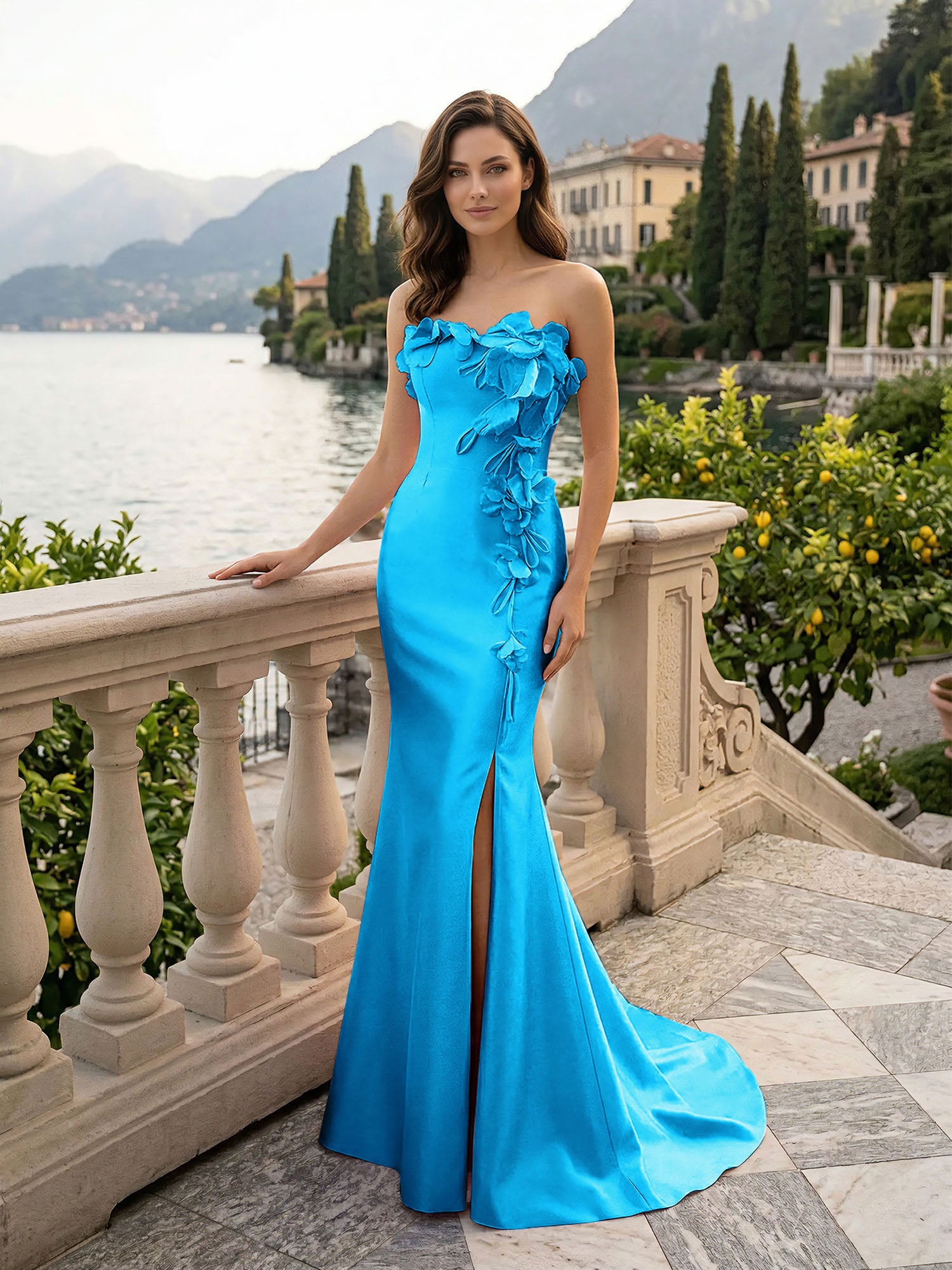 Step into a garden of romance with this elegant blush pink evening gown, a breathtaking and feminine addition to the Dreamylily collection designed for the woman who loves delicate, artistic details. The bodice features a classic strapless neckline that perfectly highlights your shoulders, beautifully accented by stunning 3D floral appliqués that bloom at the bust and cascade gracefully down the side of the waist and hip. Crafted from luxurious, luminous satin, the form-fitting silhouette expertly hugs your curves before falling to a floor-length hem. A daring thigh-high slit adds a touch of modern allure and effortless movement, making this the perfect choice for a dreamy 2026 prom night, a romantic spring formal, or an unforgettable high-end bridesmaid look.