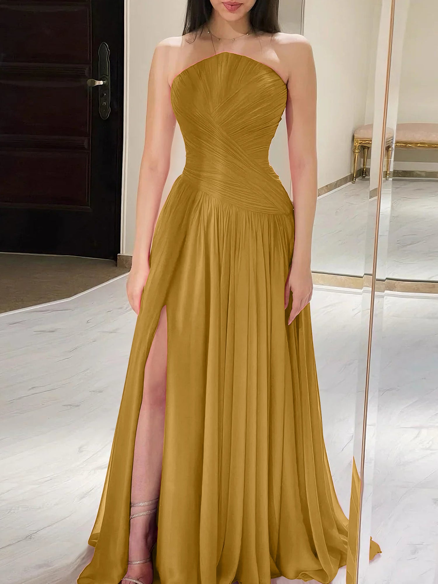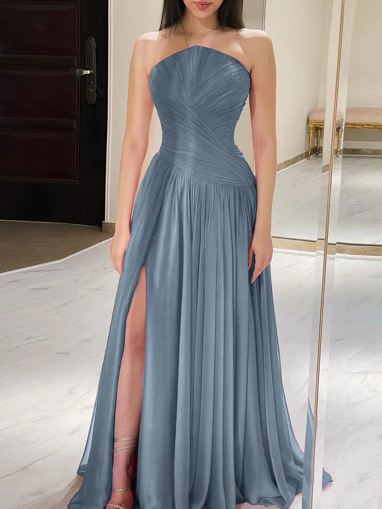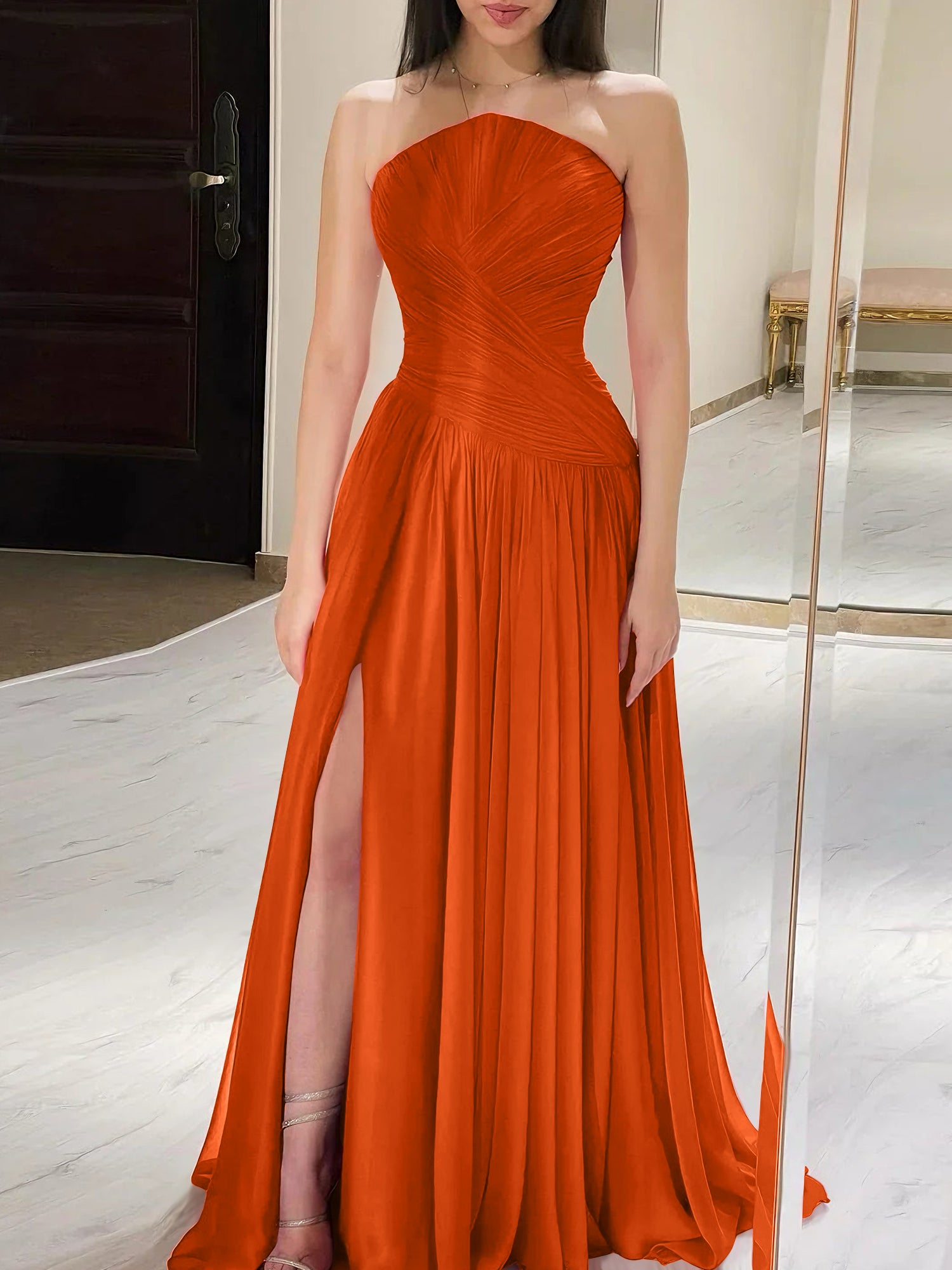 Red Pleated Chiffon Strapless Long Prom Dress with Slit