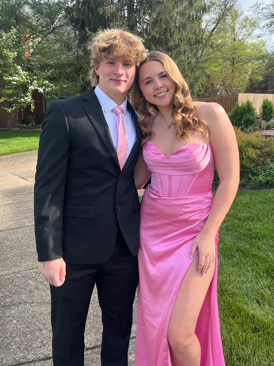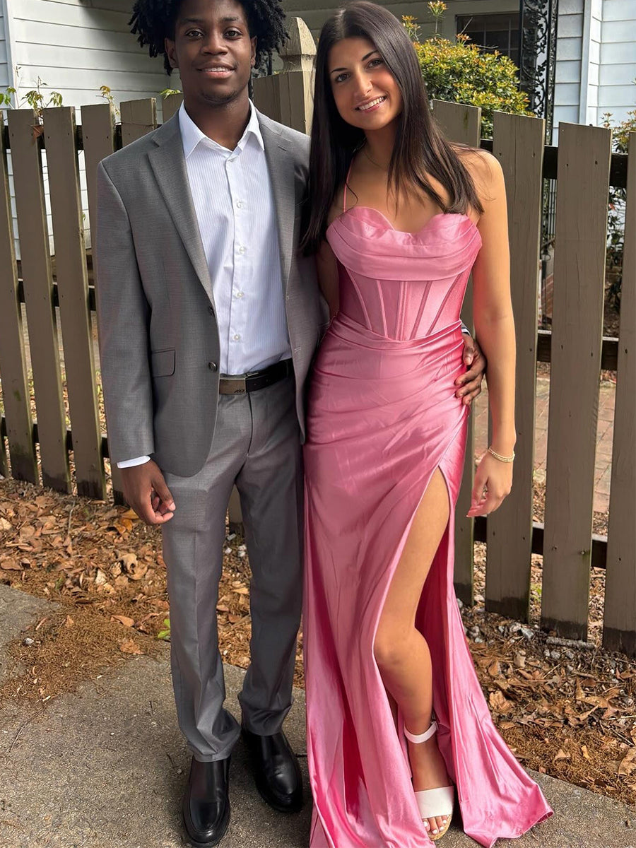 Make a stunning entrance in this electric royal blue prom gown. The design creates a perfect balance of soft romance and structured glamour. The bodice features a chic strapless cowl neckline that drapes elegantly across the bust, sitting atop a fitted corset waist with visible vertical boning for a snatched, defined look. The skirt is crafted from lustrous satin that is artfully ruched at the hip, flowing into a sleek floor-length silhouette with a daring high thigh slit. This gown is a powerful choice for prom, military balls, or any formal event where you want to radiate confidence.