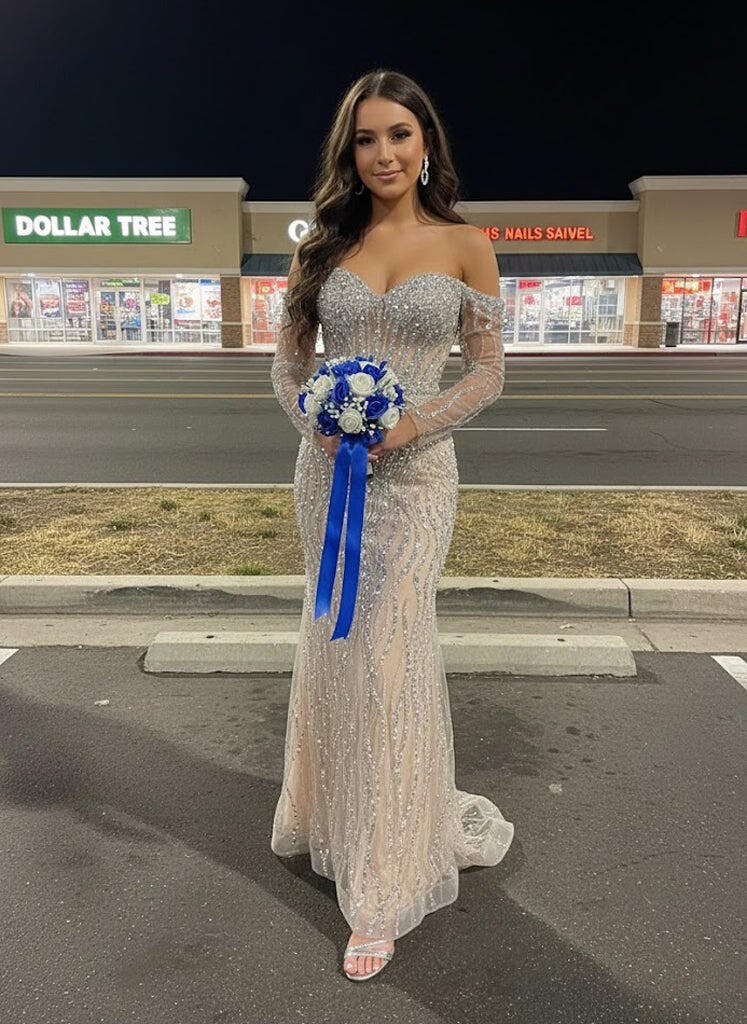Exude sophistication in this breathtaking sheer evening gown. Adorned with intricate beadwork and shimmering sequins, this figure-hugging dress features an off-the-shoulder sweetheart neckline and sheer long sleeves for an ethereal touch. The fitted bodice accentuates the waist, while the flowing skirt cascades gracefully to the floor, creating a mesmerizing silhouette. Perfect for red carpet events, formal galas, or special occasions, this gown ensures you shine with elegance and charm.