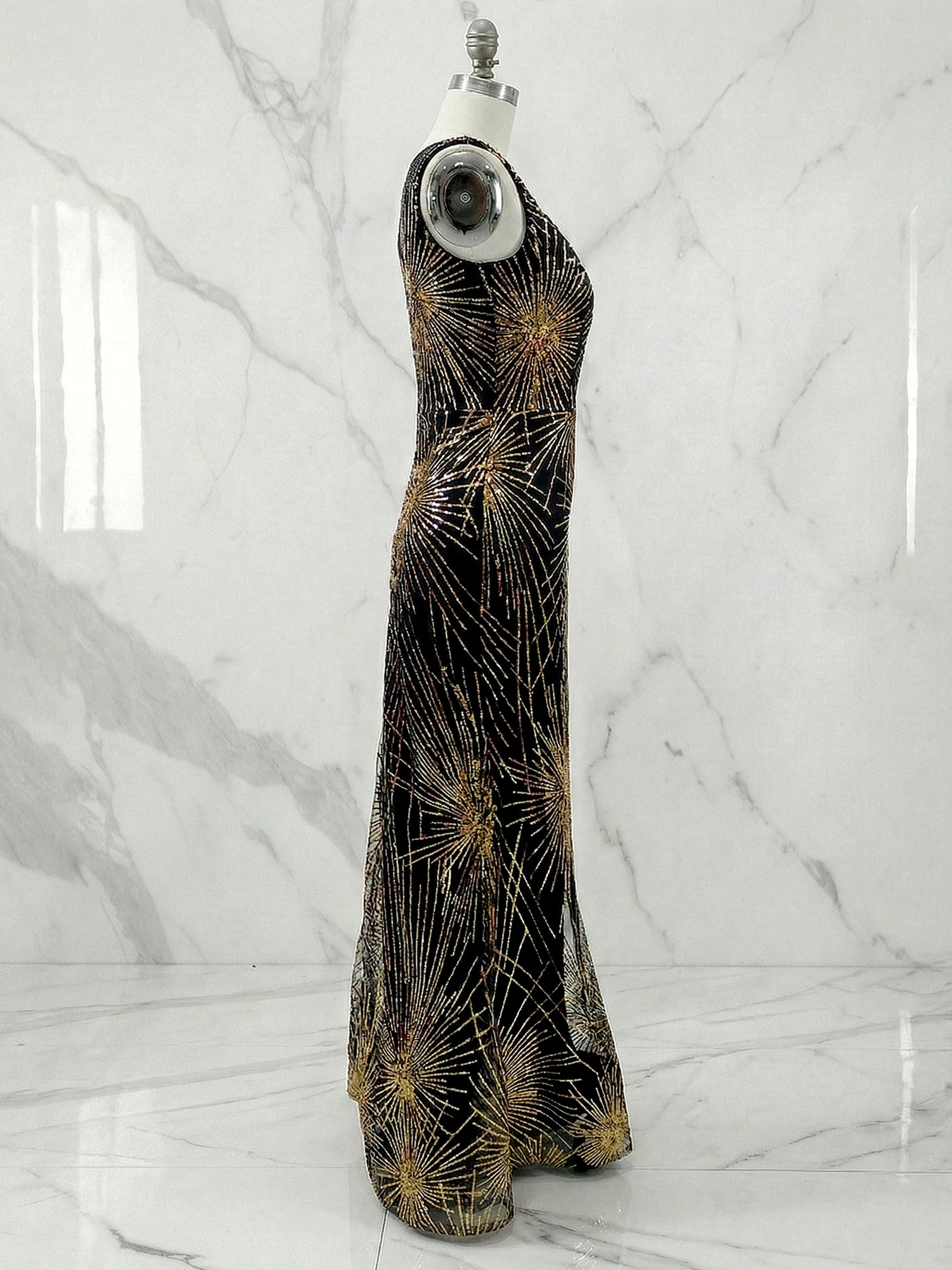 Light up the night in this spectacular black and gold evening gown, designed for the woman who wants to channel Art Deco glamour and celestial beauty. The bodice features a sophisticated V-neckline supported by comfortable wide straps, creating a timeless and flattering frame for the upper body. The true showstopper is the intricate sequin pattern: exploding gold starbursts or fireworks are scattered across the black mesh backdrop, creating a dynamic and high-contrast visual effect that draws the eye to the waist and hips. The silhouette is a classic mermaid shape, hugging the curves tightly before flaring out at the knee into a sheer, sweeping hem. Perfect for a New Year's Eve gala, a Gatsby-themed party, or a sophisticated black-tie wedding.