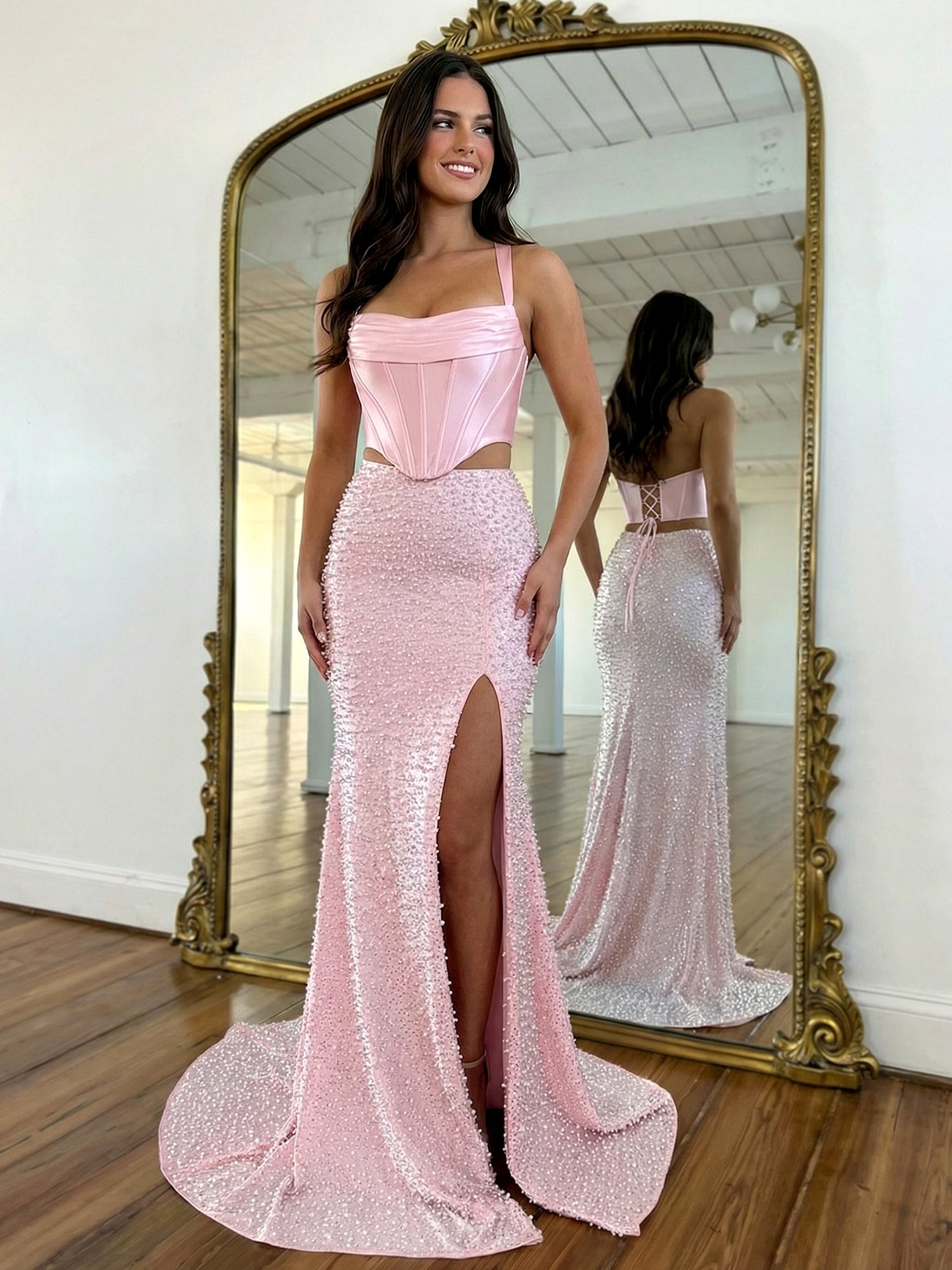 Make a modern, unforgettable statement in this stunning pink two-piece evening gown, a trendy and glamorous addition to the Dreamylily collection designed for the woman who loves a fashion-forward silhouette. The top features a chic, structured satin corset with a flattering draped neckline, supportive thick straps, and a highly contoured pointed basque hemline that perfectly defines the waist. The mirror's reflection reveals a classic corset lace-up back that ensures a secure, customized fit. Paired perfectly with the smooth bodice is a spectacular, form-fitting skirt heavily encrusted with lustrous pearl beading from waist to hem. The skirt beautifully hugs the hips before cascading to the floor, highlighted by a daring thigh-high slit and a graceful sweeping train for effortless movement. This stylish ensemble is an incredible choice for a trend-setting 2026 prom night, a standout pageant appearance, or an exclusive gala.