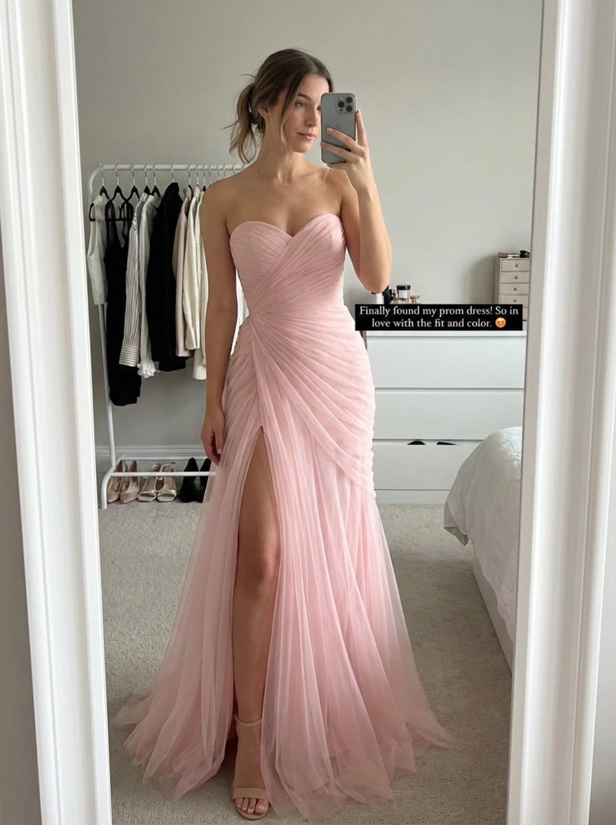 Strapless Sweetheart High Slit Tulle Pleat Prom Dress Evening Dresses