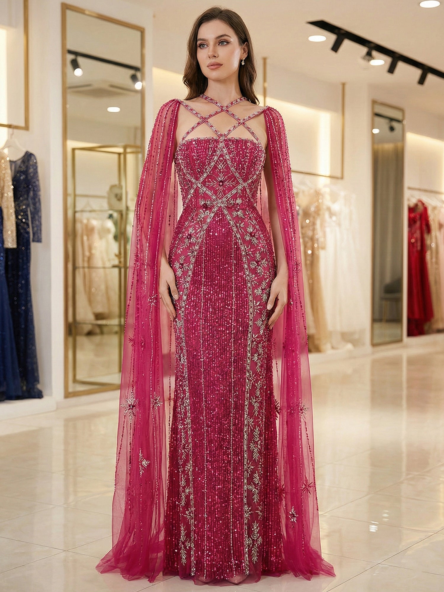 - Straps & Sleeves: Floor-Length Sheer Cape Sleeves
