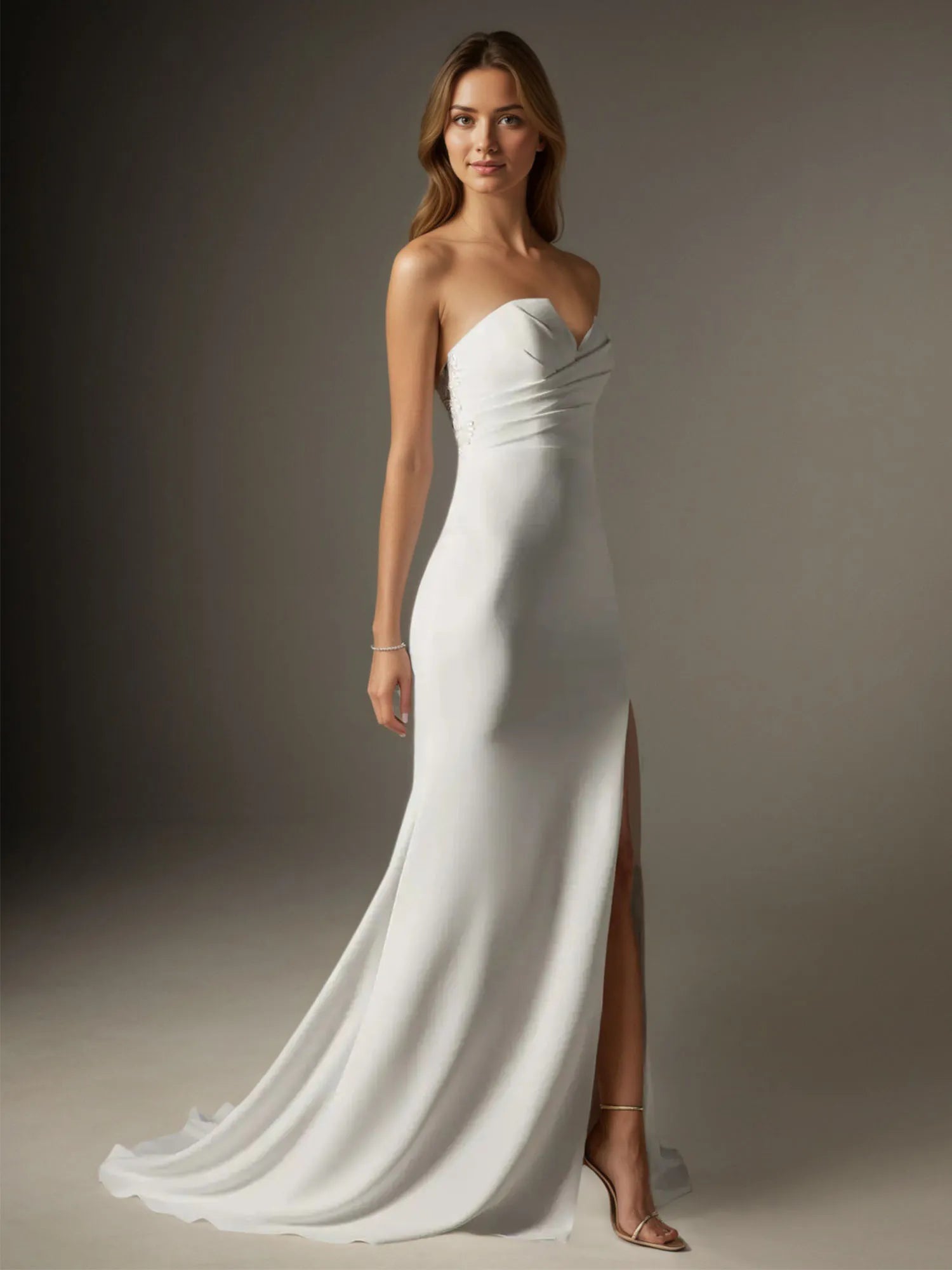 This wedding gown is a bold fusion of modern chic and allure. It features an off-the-shoulder neckline, sheer detachable sleeves, and a thigh-high slit. The form-fitting silhouette and smooth fabric create a sophisticated, red-carpet-worthy look, perfect for brides who want a fashion-forward, confidently sexy aesthetic on their special day.