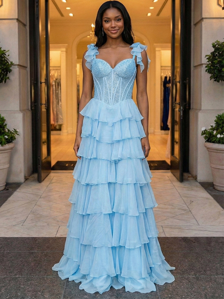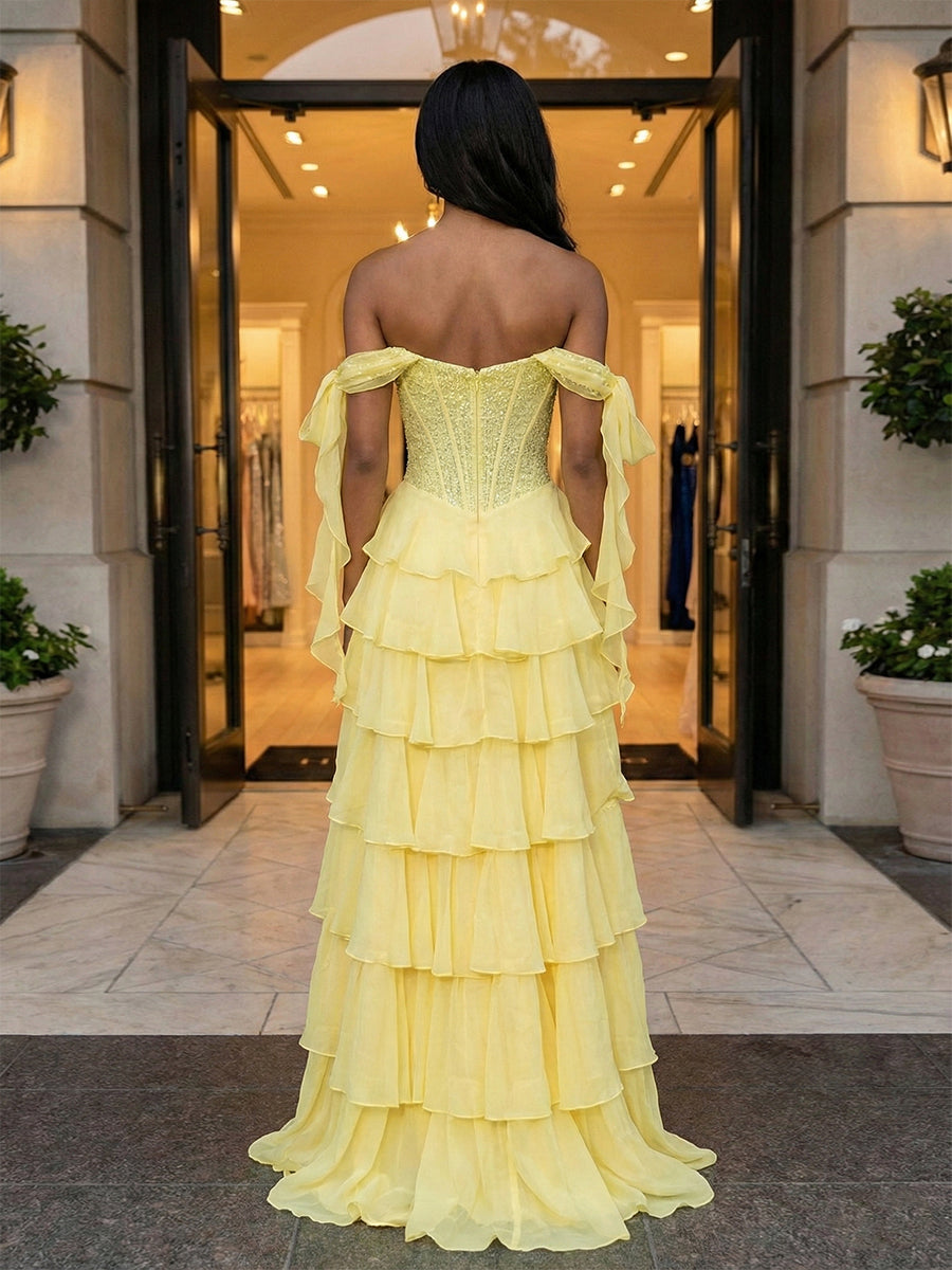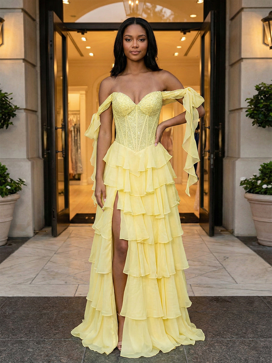 Bring the sunshine to any event with this joyful yellow prom gown, designed to blend playful romance with high-fashion trends. The bodice features a classic sweetheart neckline and a structured sheer corset, intricately embellished with matching yellow beadwork that adds a subtle, sunny shimmer. Unique to this design are the whimsical off-the-shoulder ruffled sleeves, which drape effortlessly like ribbons for a soft, fairy-like touch. The skirt is a cascade of lively ruffles arranged in tiers, featuring a daring thigh-high slit that adds movement and breaks up the volume for a youthful, modern look. Perfect for spring proms, garden parties, or any occasion where you want to channel a modern-day "Belle" aesthetic.