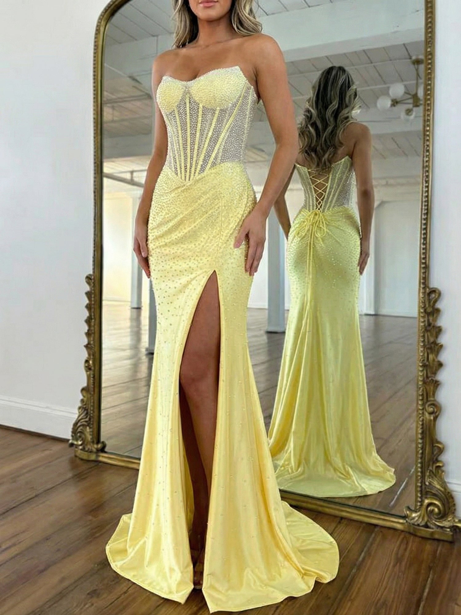 - Features: Corset Bodice, Thigh-High Slit, Glitter Detail